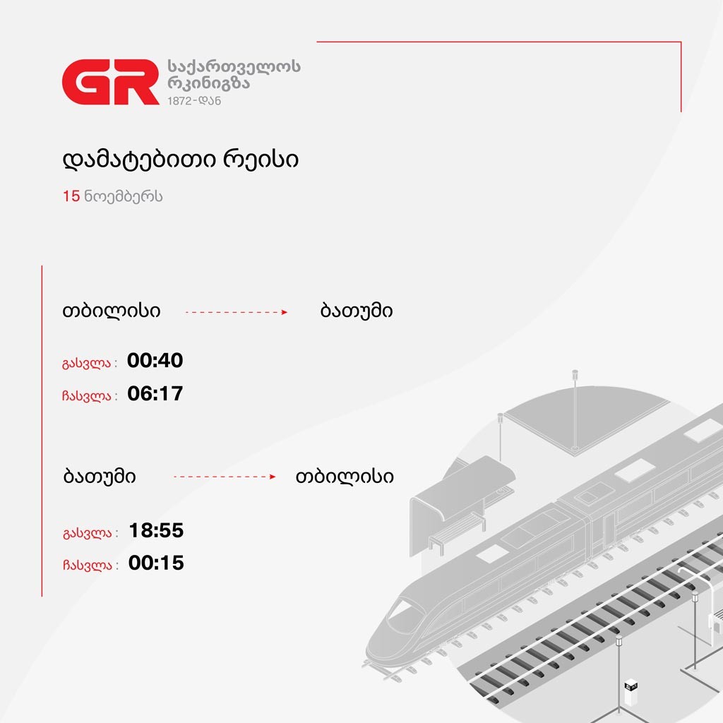 მგზავრების თხოვნის გათვალისწინებით, საქართველოს რკინიგზა, რაგბის თამაშზე დასწრების მსურველთათვის, 15 ნოემბერს თბილისი-ბათუმი-თბილისის მიმართულებით შტადლერის ტიპის მატარებლის რეისს ამატებს, – ინფორმაციას ამის შესახებ საქართველოს რკინიგზა ავრცელებს.