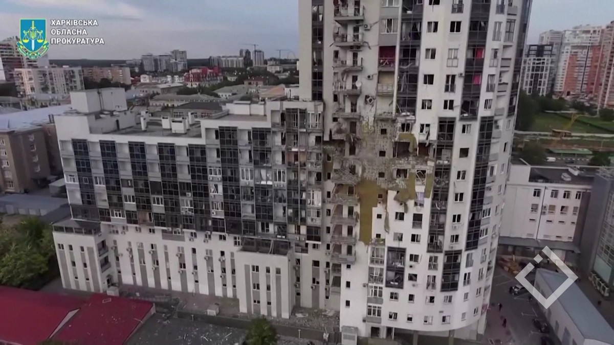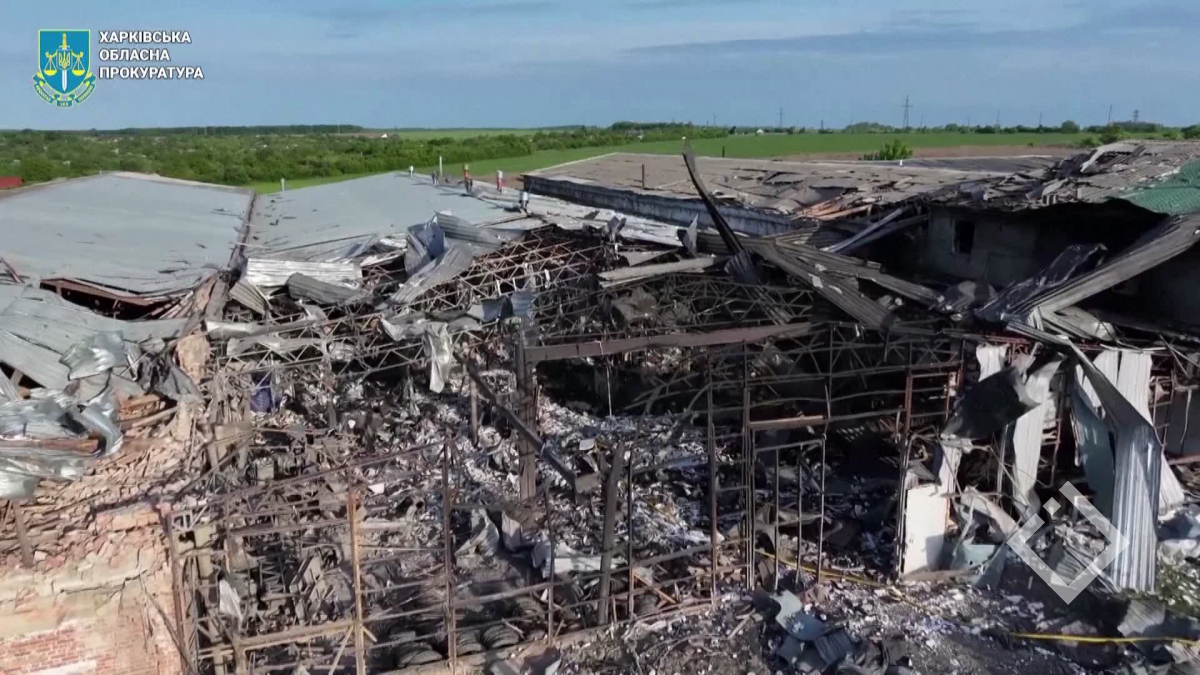 დრონით გადაღებულ კადრებზე ასახული შენობები, რომლებიც უკრაინის ხელისუფლების თქმით, ხარკოვის რეგიონში დასახლებულ პუნქტზე რუსეთის სარაკეტო დარტყმის შედეგად განადგურდა. ხარკოვის რეგიონულმა...