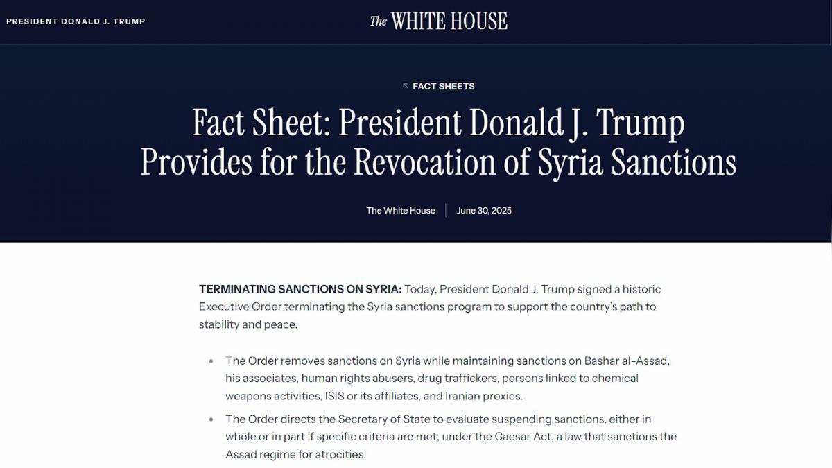აშშ-ის მიერ სირიის მიმართ სანქციების გაუქმება ძალაში პირველი ივლისიდან შევა. ამის შესახებ თეთრი სახლის მიერ გავრცელებულ განცხადებაშია ნათქვამი. ჯერ კიდევ...
