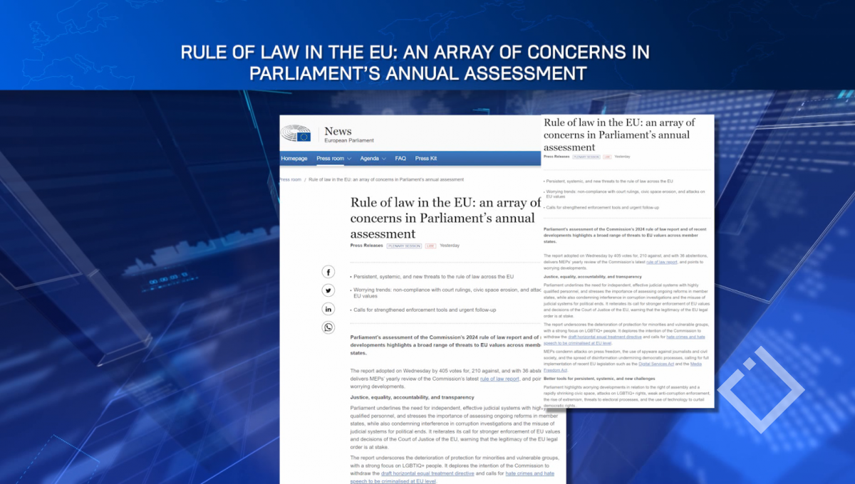 დღესვე ევროპარლამენტმა კიდევ ერთი რეზოლუცია მიიღო, რომელშიც ევროკავშირის ქვეყნებში კანონის უზენაესობის მდგომარეობის მნიშვნელოვან გაუარესებაზეა საუბარი. განსაკუთრებული შეშფოთება გამოხატულია სასამართლო გადაწყვეტილებების...