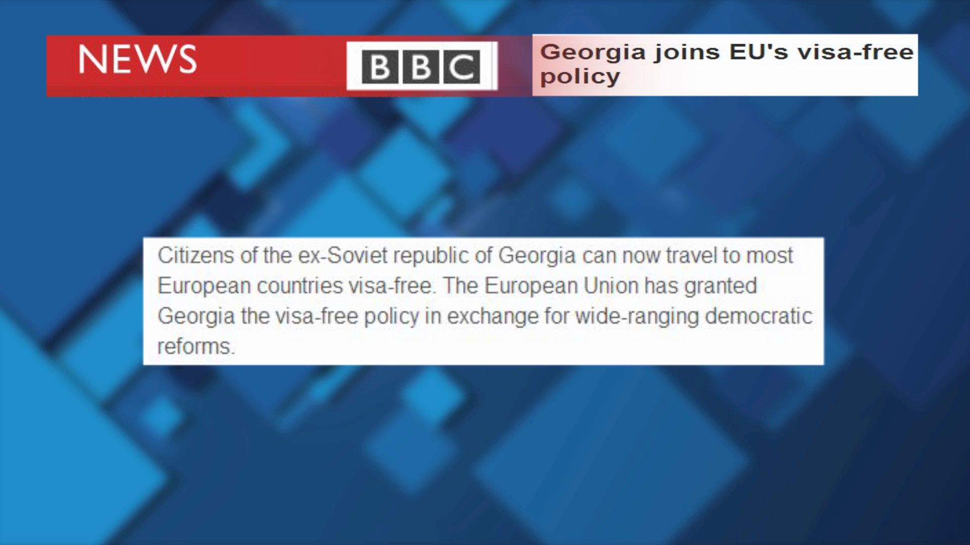 საქართველო ევროკავშირის უვიზო მიმოსვლის რეჟიმს შეუერთდა-წერს ბრიტანული ტელეკომპანია. ექს-საბჭოთა რესპუბლიკის მოქალაქეები ევროპის ქვეყნებში უვიზოდ შეძლებენ მოგზაურობას. ევროკავშირმა საქართველოს ვიზალიბერალიზაცია ქვეყანაში...