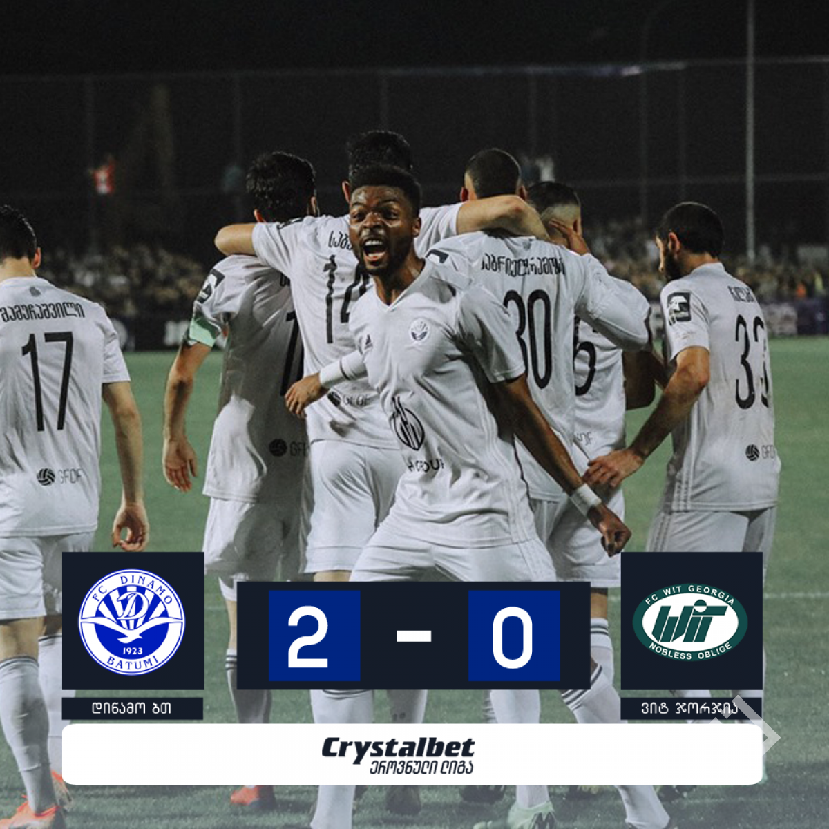 "დინამო" ბათუმმა საკუთარ მოედანზე "ვიტ ჯორჯია" 2-0 დაამარცხა. მატჩის პირველი გოლი პირველ ტაიმში 27 წუთზე "დინამო" ბათუმის ბრაზილიელმა ფეხბურთელმა ჯოვინო ფლამარიონმა...