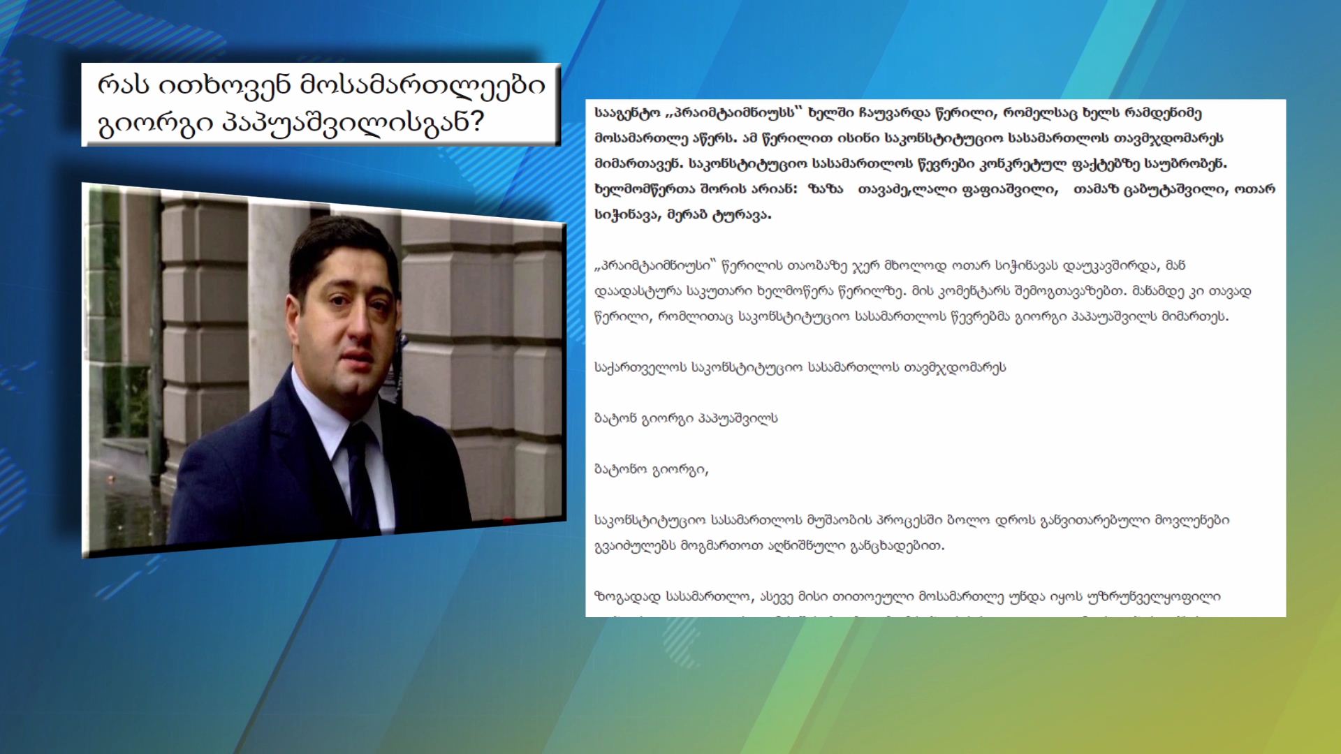 საკონსტიტუციო სასამართლოს 5 მოსამართლე გიორგი პაპუაშვილს მიმართავს. "ზაზა თავაძე, ლალი ფაფიაშვილი, თამაზ ცაბუტაშვილი, ოთარ სიჭინავა და მერაბ ტურავა ფიქრობენ, რომ...