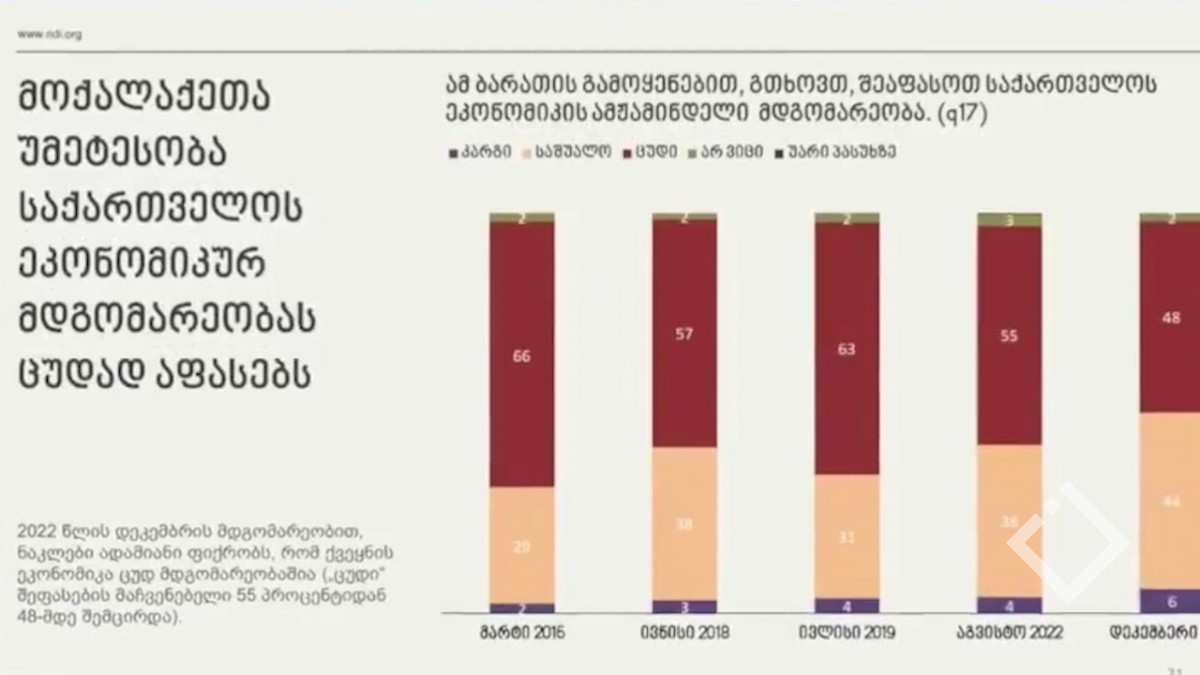 ენ-დი-აი-ს მიერ ჩატარებული კვლევის მიხედვით მოსახლეობა ყველაზე მეტად ცუდ ეკონომიკურ მდგომარეობას უჩივის. გამოკითხულთა უმრავლესობას ფასების ზრდა/ინფლაცია, უმუშევრობა, სიღარიბე და დაბალი...