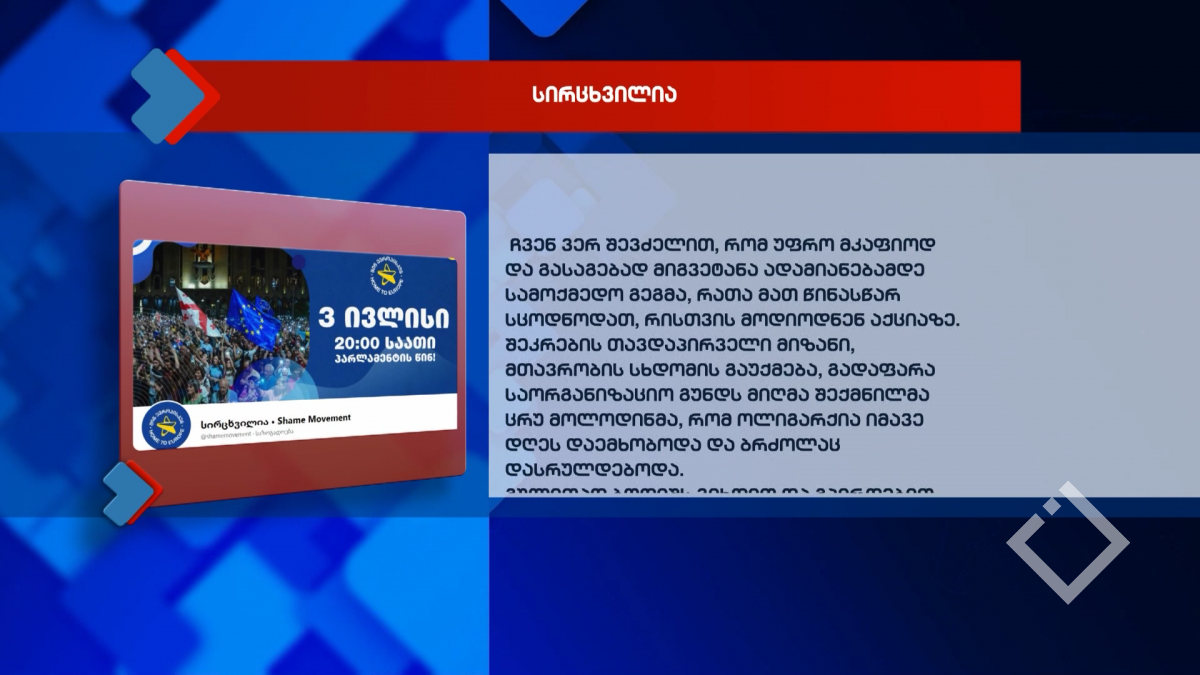 „სირცხვილიას“ ბოდიში. „Facebook”-ზე გამოქვეყნებული ტექსტის თანახმად, 3 ივლისის მასშტაბურმა პროტესტმა საზოგადოების ნაწილს სამართლიანი კითხვები გაუჩინა დემონსტრაციის მიზნებსა და გეგმასთან დაკავშირებით....