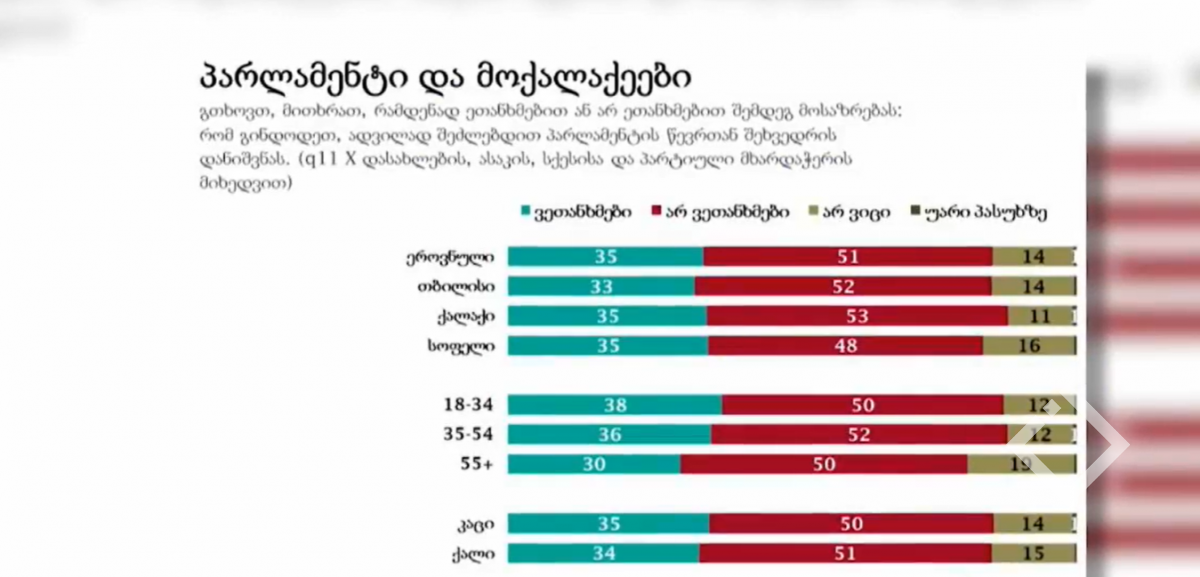 შეკითხვაზე როგორი მიმართულებით ვითარდება საქართველო გამოკითხული მოსახლეობის 44% ფიქრობს, რომ - არასწორად. ამავე შეკითხვაზე მოსახლეობის 25%-ს აქვს დადებითი შეფასება....