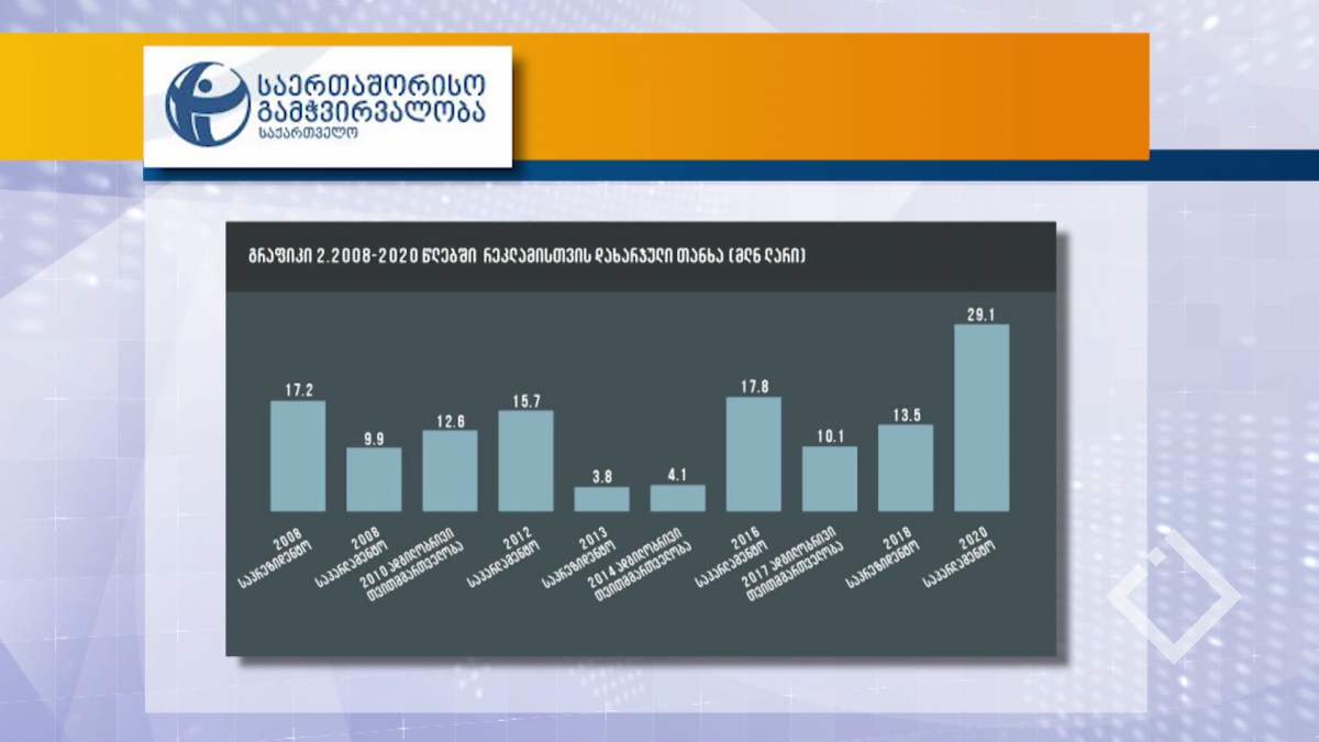 „საერთაშორისო გამჭვირვალობა - საქართველოს” კვლევის შედგების მიხედვით, მმართველი პარტიის სუბიექტებმა ან მათმა მხარდაჭერილმა კანდიდატებმა 2008-2020 წლებში, წინასაარჩევნო პერიოდში რეკლამაში 98...