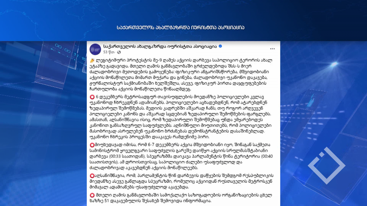 ლეგიტიმური პროტესტის მე-9 ღამეს აქციის დარბევა საპოლიციო ტერორის ახალ ეტაპზე გადავიდა. მთელი ღამის განმავლობაში გრძელდებოდა შსს-ს მიერ ძალადობრივი მეთოდების გამოყენება:...