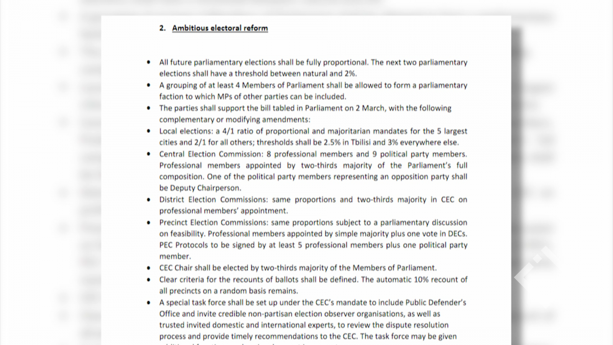 მოლაპარაკებების დასრულებისთანავე ევროკავშირის წარმომადგენლობამ საქართველოში პოლიტიკური პარტიებისთვის შეთავაზების ტექსტი გამოაქვეყნა. ქრისტიან დანიელსონის განმარტებით, ამ დოკუმენტით ყველა საკითხზე მაღლა ქვეყნის ინტერესები...