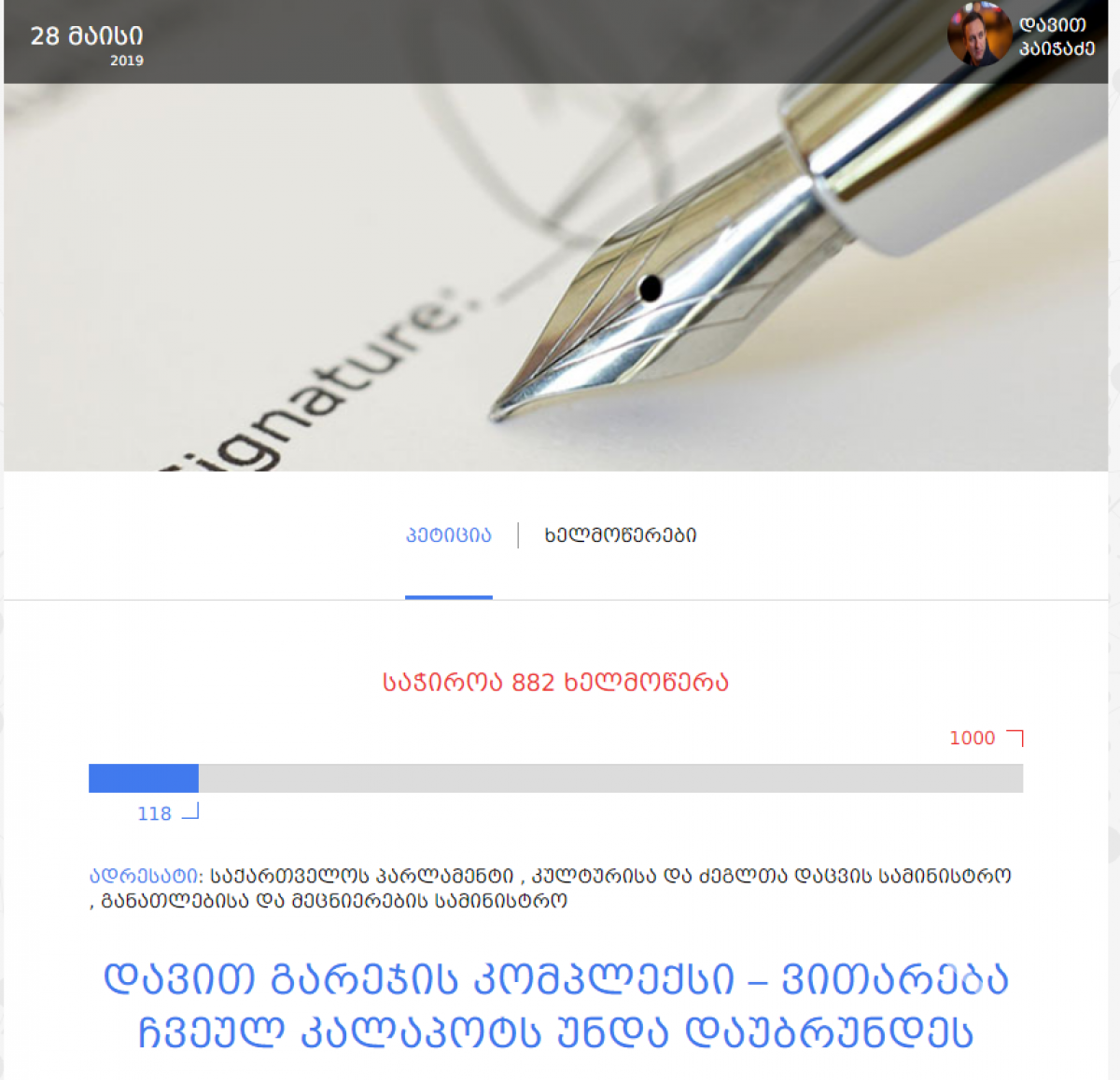 დავით გარეჯთან დაკავშირებულ პეტიცია შეიქმნა. მისი ადრესატი საქართველოს პარლამენტი და ასევე კულტურისა და ძეგლთა დაცვის სამინისტროა. პეტიციაში წერია, რომ დავით გარეჯის...