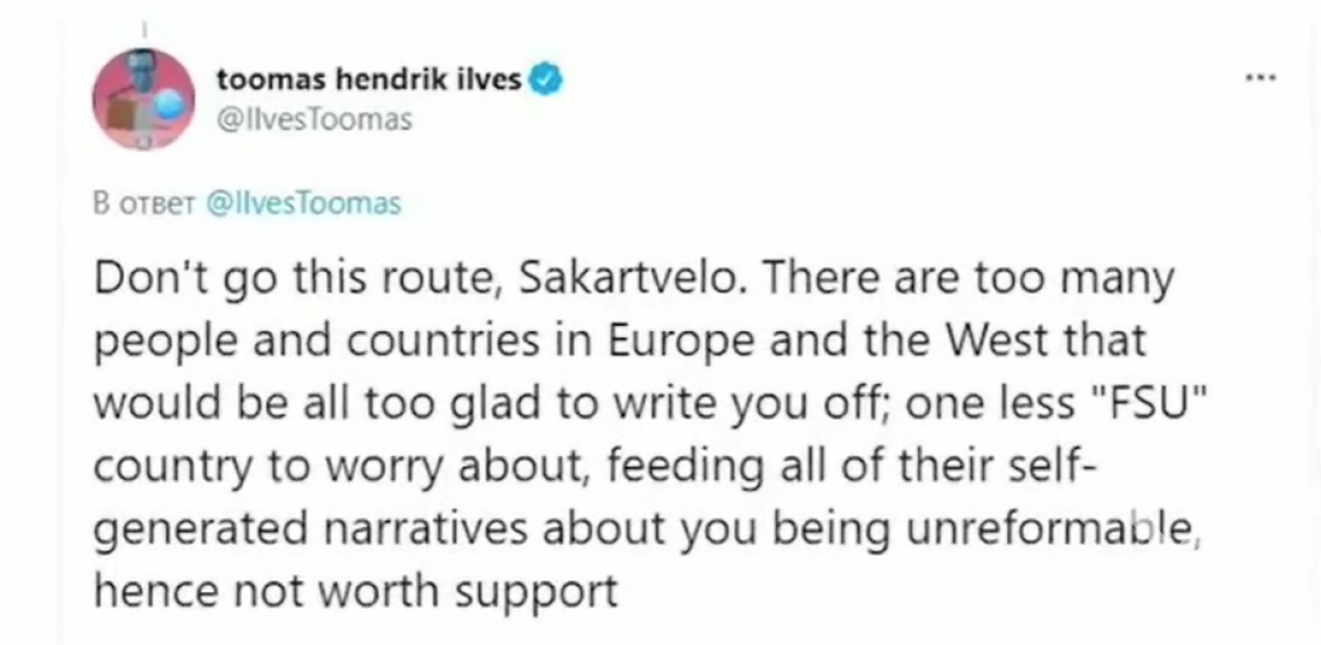 საქართველოში მიმდინარე მოვლენებს მსოფლიო ლიდერები აფასებენ. ესტონეთის ყოფილი პრეზიდენტი საქართველოში განვითარებულ მოვლენებს ტვიტერზე ეხმიანება.„ნუ წახვალ ამ გზით, საქართველო. ძალიან ბევრი...