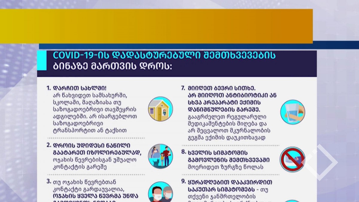 "არ წახვიდეთ სამსახურში, სკოლაში, მაღაზიასა თუ საზოგადოებრივი თავშეყრის ადგილებში. არ ისარგებლოთ საზოგადოებრივი ტრანსპორტით ან ტაქსით"-ეს არის COVID-19-ის დადასტურებული შემთხვევების ბინაზე...