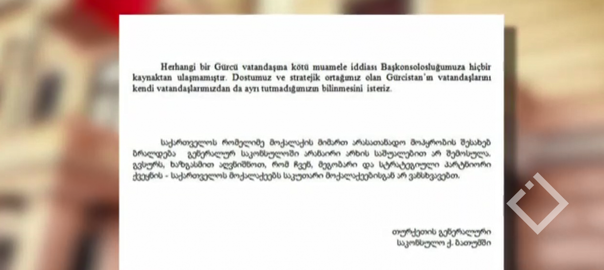 თურქეთის გენერალურმა საკონსულომ ბათუმში განცხადება გაავრცელა, სადაც აღნიშნულია, რომ საქართველოს რომელიმე მოქალაქის მიმართ არასათანადო მოპყრობის შესახებ ბრალდება გენერალურ საკონსულოში არანაირი...