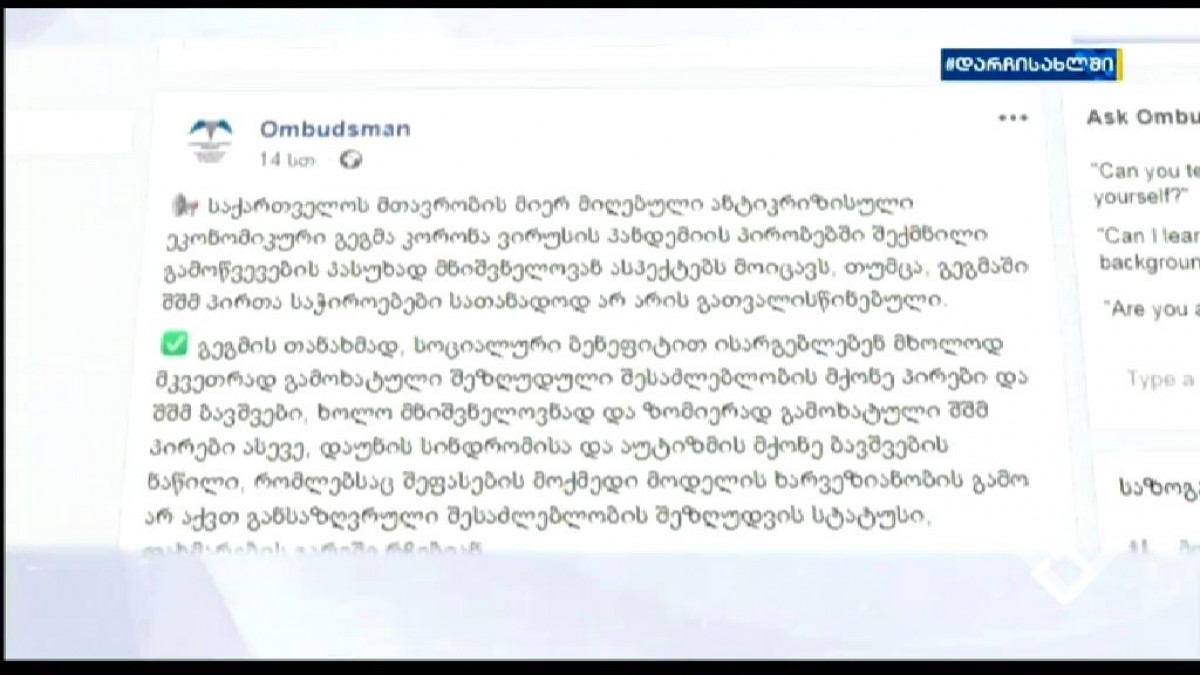 საქართველოს სახალხო დამცველის მოსაზრებით, საქართველოს მთავრობის მიერ მიღებული ანტიკრიზისული ეკონომიკური გეგმა კორონავირუსის პანდემიის პირობებში შექმნილი გამოწვევების პასუხად მნიშვნელოვან ასპექტებს მოიცავს,...