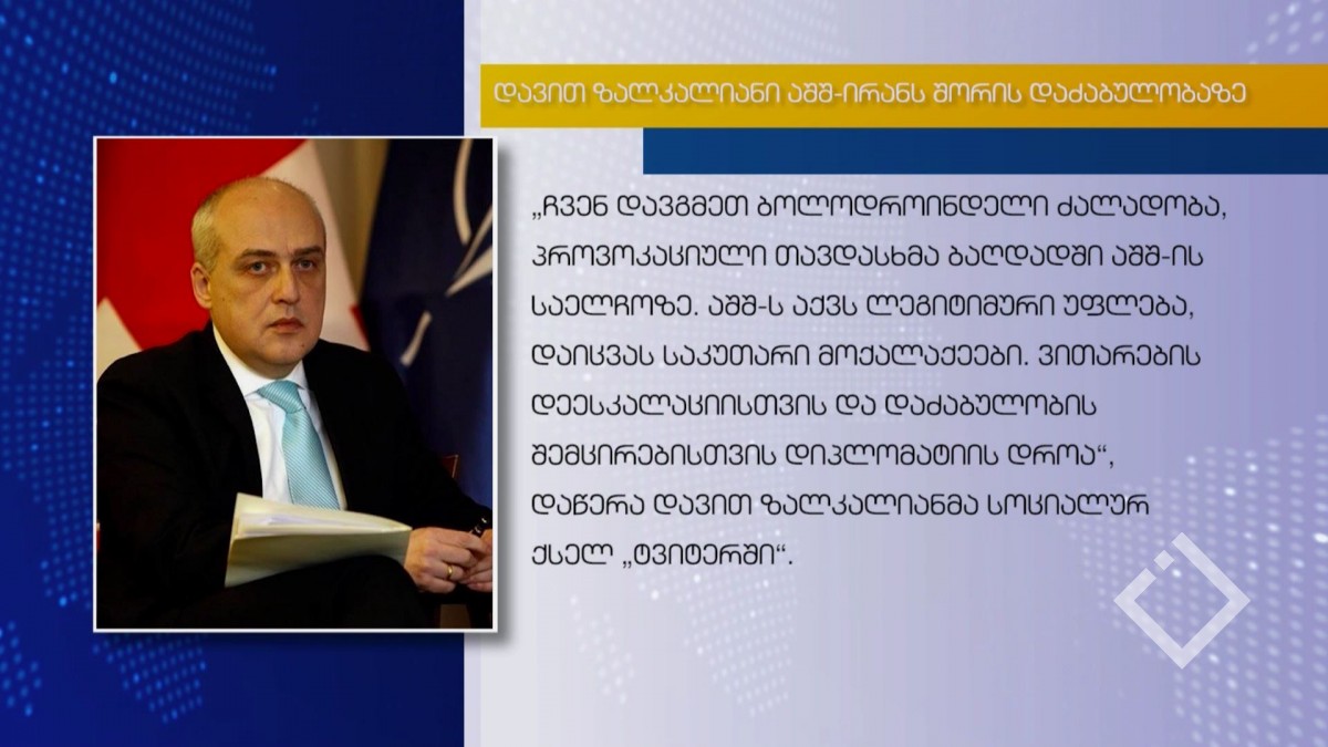 ვითარების დეესკალაციისთვის და დაძაბულობის შემცირებისთვის დიპლომატიის დროა, – ამის შესახებ საქართველოს საგარეო საქმეთა მინისტრმა, დავით ზალკალიანმა აშშ-სა და ირანს შორის...
