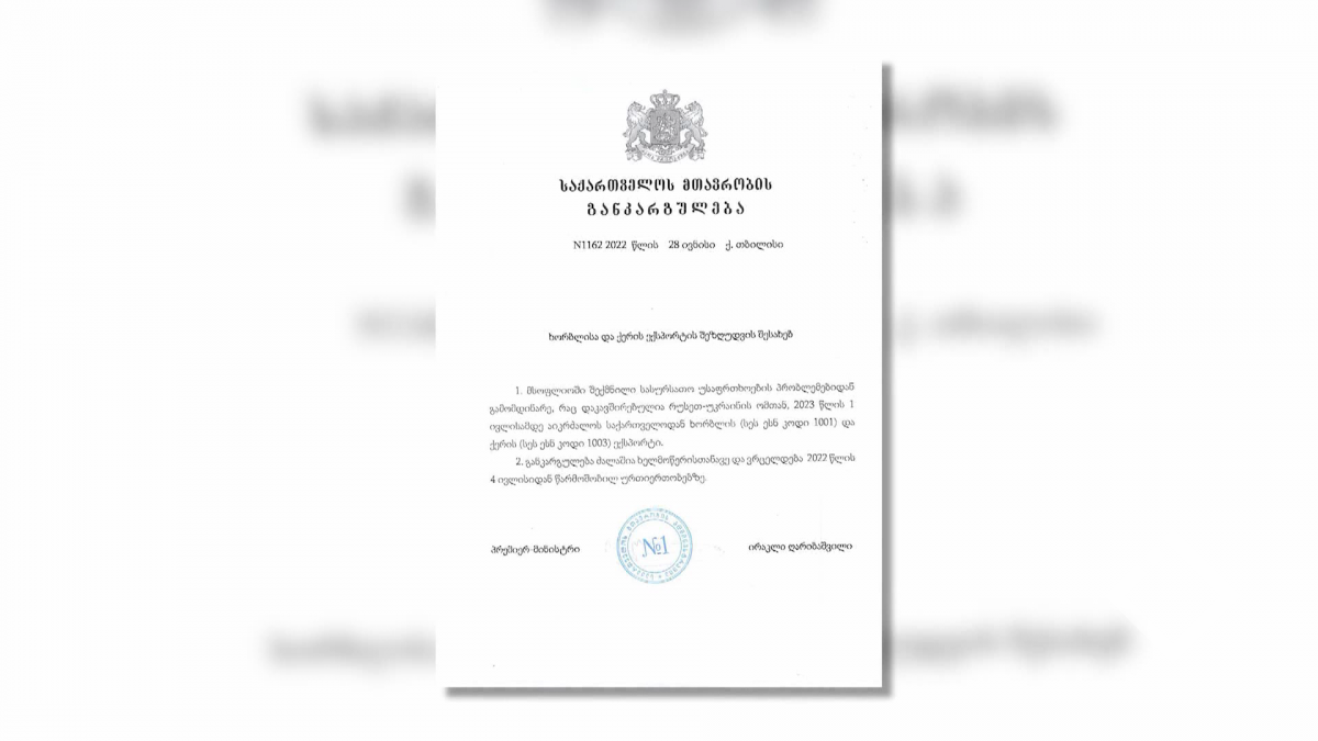 2023 წლის 1-ელ ივლისამდე საქართველოდან ხორბლის და ქერის ექსპორტი იკრძალება. დოკუმენტს პრემიერ-მინისტრმა მოაწერა ხელი. გადაწყვეტილების მიზეზი მსოფლიოში შექმნილი სასურსათო უსაფრთხოების...