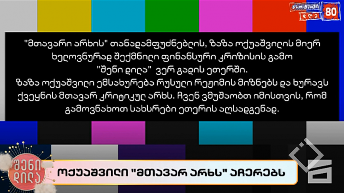 "მთავარი არხი” გადაცემებს აჩერებს. ამის შესახებ მაუწყებელმა განცხადება გაავრცელა. “მთავარი არხის" თანადამფუძნებლის, ზაზა ოქუაშვილის მიერ ხელოვნურად შექმნილი ფინანსური კრიზისის გამო...