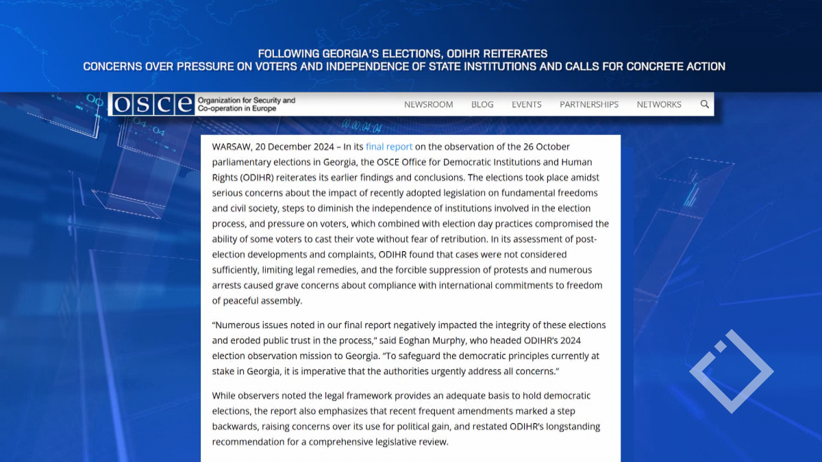 ეუთო-ოდირი 26 ოქტომბრის საპარლამენტო არჩევნებთან დაკავშირებით მომზადებული ანგარიშის შესახებ შემაჯამებელ პრესრელიზს აქვეყნებს, სადაც წერია, რომ საბოლოო ანგარიშში იმეორებს თავის ადრინდელ...