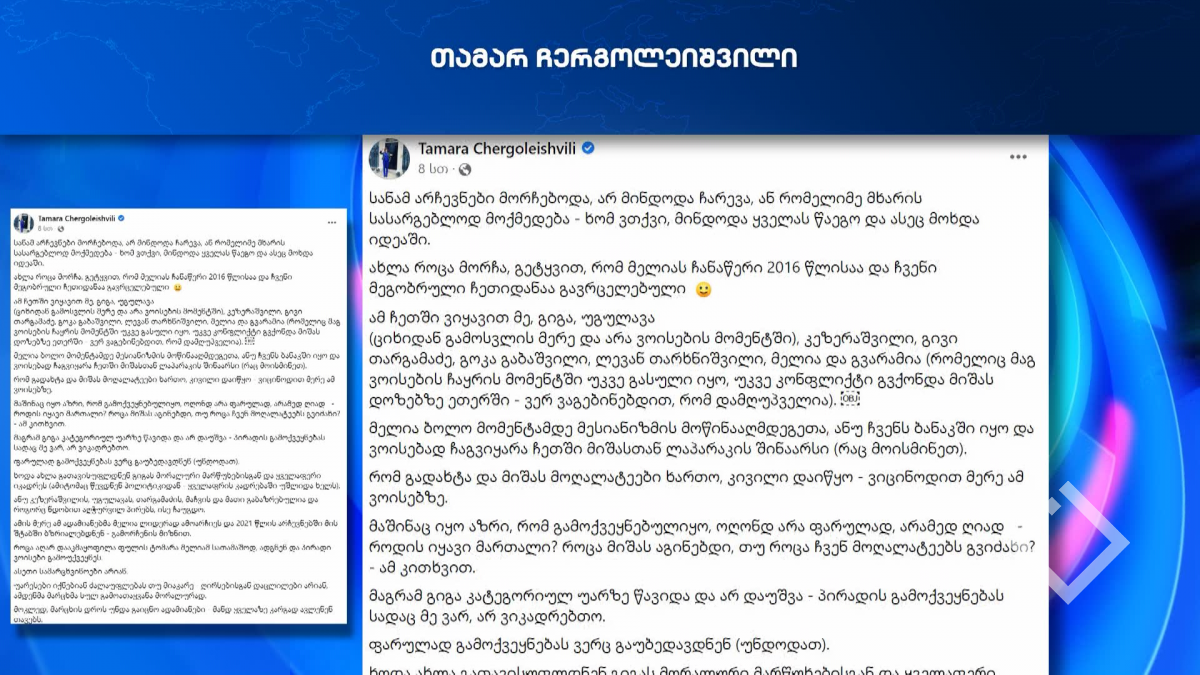 ჟურნალისტი თამარ ჩერგოლეიშვილი გავრცელებულ აუდიოჩანაწერთან დაკავშირებით, რომელშიც ნიკა მელია ფიგურირებს, სოციალურ ქსელში პოსტს აქვეყნებს. პოსტიდან ვგებულობთ, რომ აუდიო ჩანაწერი 2016 წელს...