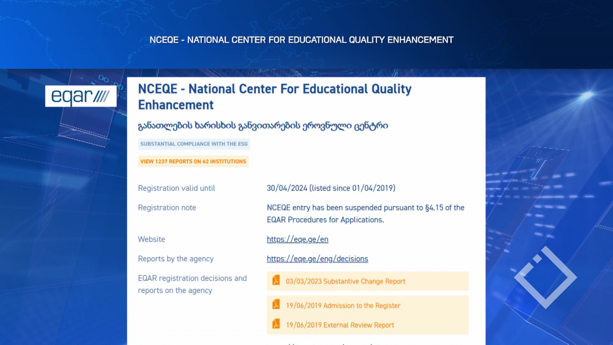 განათლების ხარისხის განვითარების ეროვნული ცენტრი უმაღლესი განათლების ხარისხის უზრუნველყოფის ევროპულ რეესტრში რეგისტრაციის გაუქმებაზე რეაგირებას ახდენს. ცენტრში განაცხადეს, რომ გადაწყვეტილებას გაასაჩივრებენ....