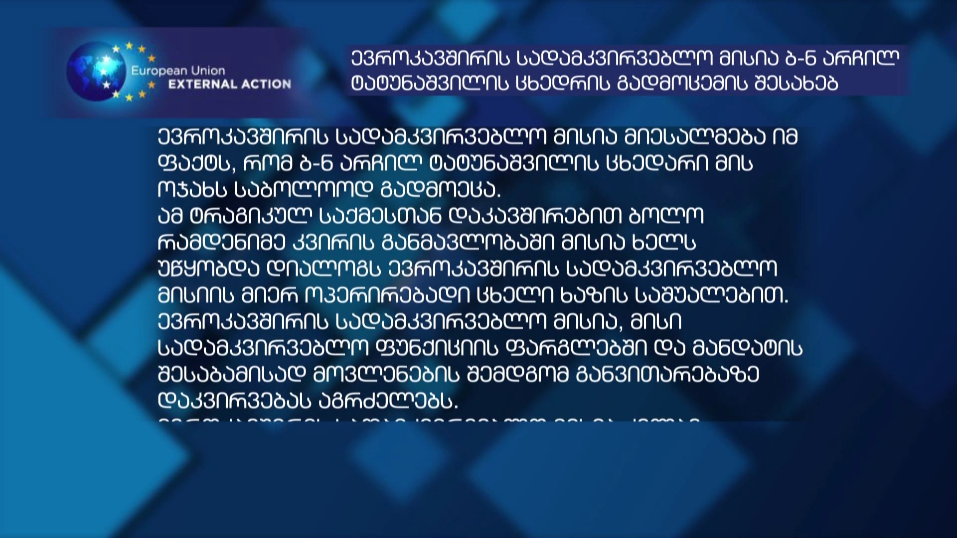 ოკუპირებული ცხინვალის მიერ ქართული მხარისთვის არჩილ ტატუნაშვილის ცხედრის გადმოცემის ფაქტს ევროკავშირის სადამკვირვებლო მისია სპეციალური განცხადებით ეხმაურება. ორგანიზაცია განცხადებას ვებგვერდზე აქვეყნებს....