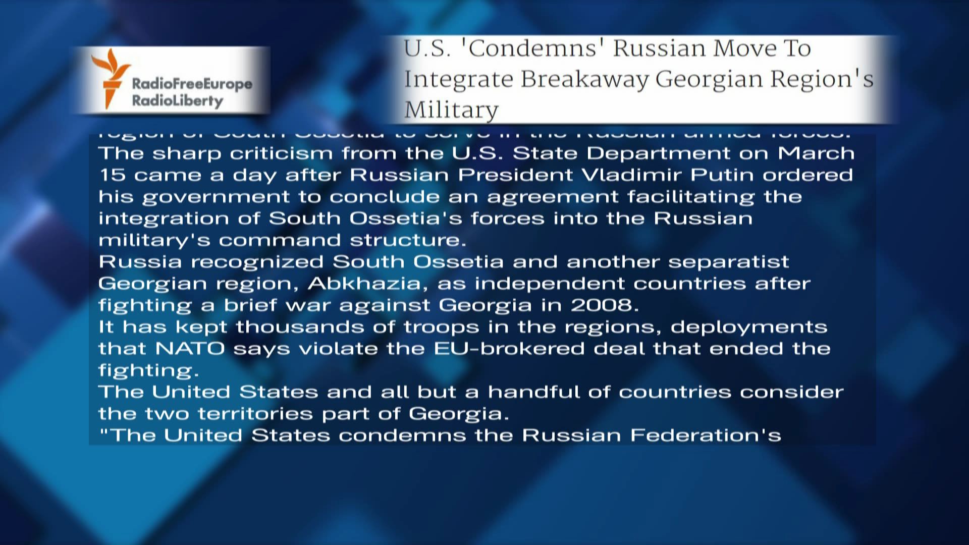 ამერიკის შეერთებულმა შტატებმა დაგმო რუსეთის გადაწყვეტილება, რომლის თანახმად, ოკუპირებული სამხრეთ ოსეთის ე.წ. შეიარაღებული ძალების ზოგიერთი ქვედანაყოფი რუსეთის არმიის შემადგენლობაში შევიდა....
