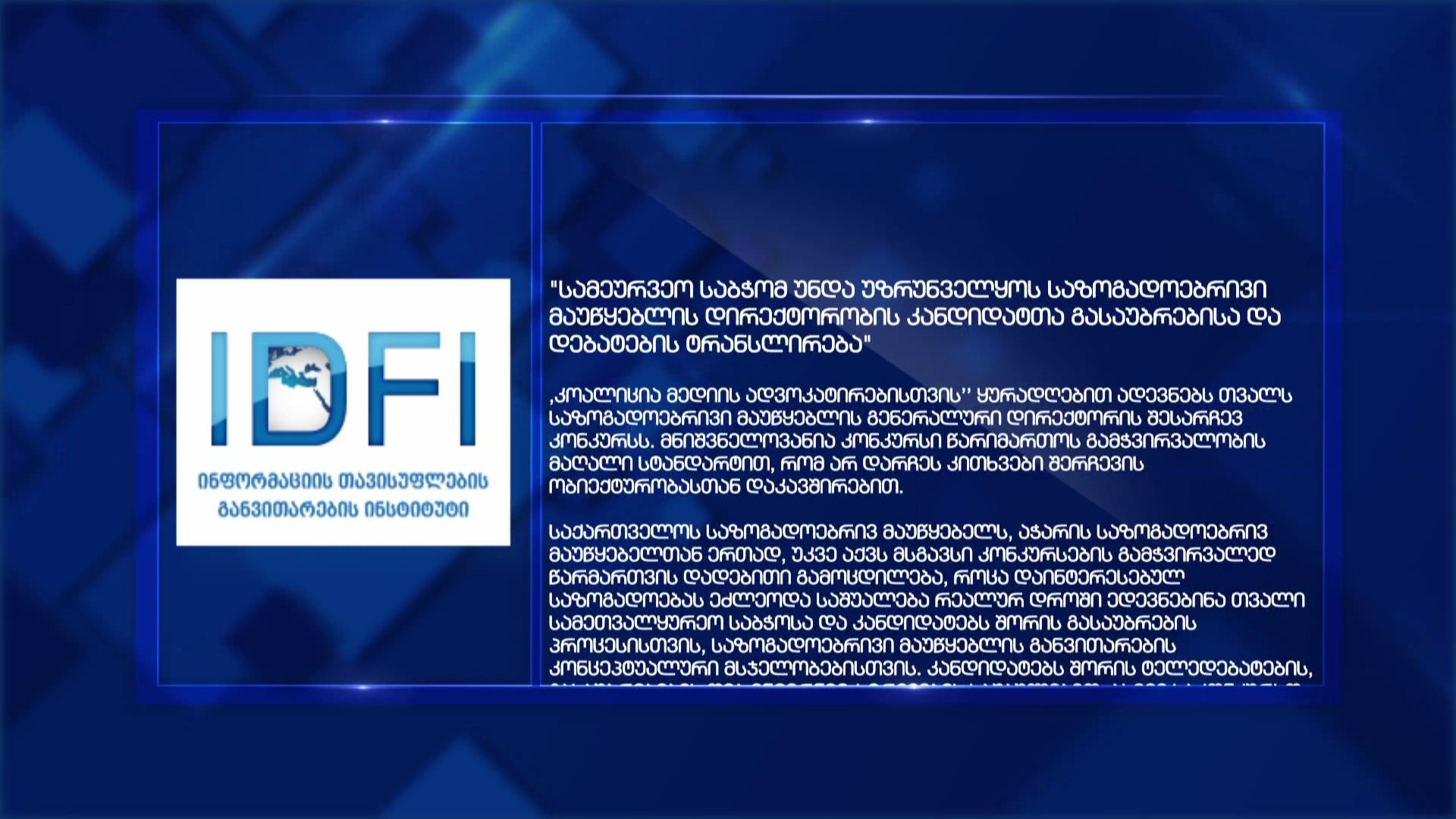 საზოგადოებრივი მაუწყებლის გენერალური დირექტორის შესარჩევ კონკურსთან დაკავშირებით განცხადებას კოალიცია "მედიის ადვოკატირებისთვის" აკეთებს. მათი თქმით, სამეურვეო საბჭომ უნდა უზრუნველყოს საზოგადოებრივი მაუწყებლის...