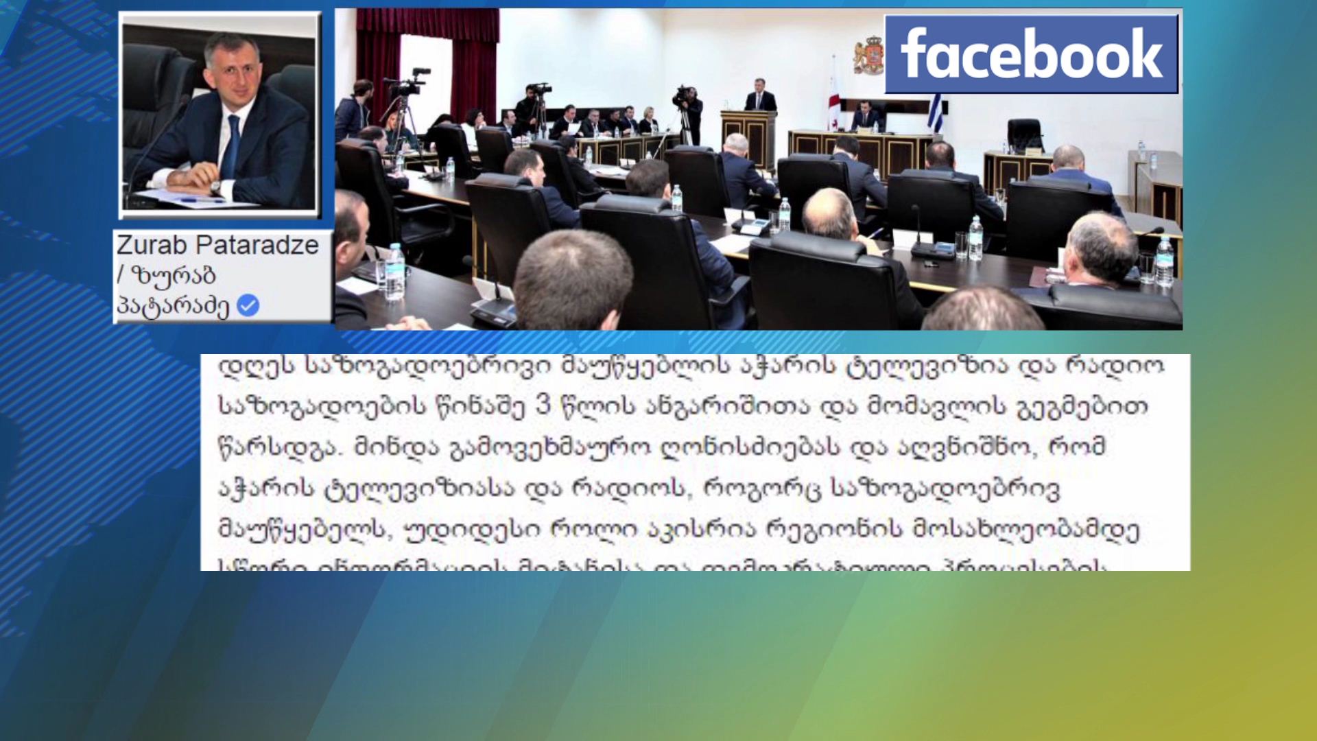 აჭარის მთავრობის თავმჯდომარე ზურაბ პატარაძე ფეისბუქის საკუთარ გვერდზე საზოგადოებრივი მაუწყებლის აჭარის ტელევიზიისა და რადიოს მენეჯმენტის 3 წლიან ანგარიშს ეხმაურება. აჭარის ტელევიზიასა...