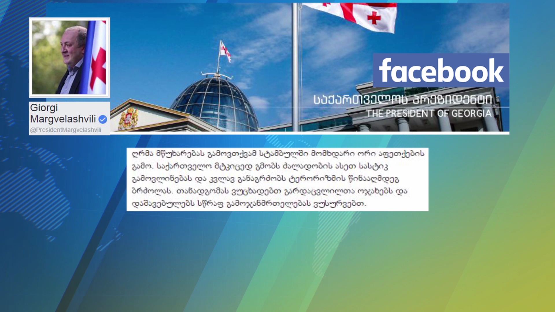 საქართველოს პრეზიდენტი თურქეთში მომხდარი აფეთქებებისას დაღუპულთა ოჯახებს უსამძიმრებს. “საქართველო მტკიცედ გმობს ძალადობის ასეთ სასტიკ გამოვლინებას და კვლავ განაგრძობს ტერორიზმის წინააღმდეგ...