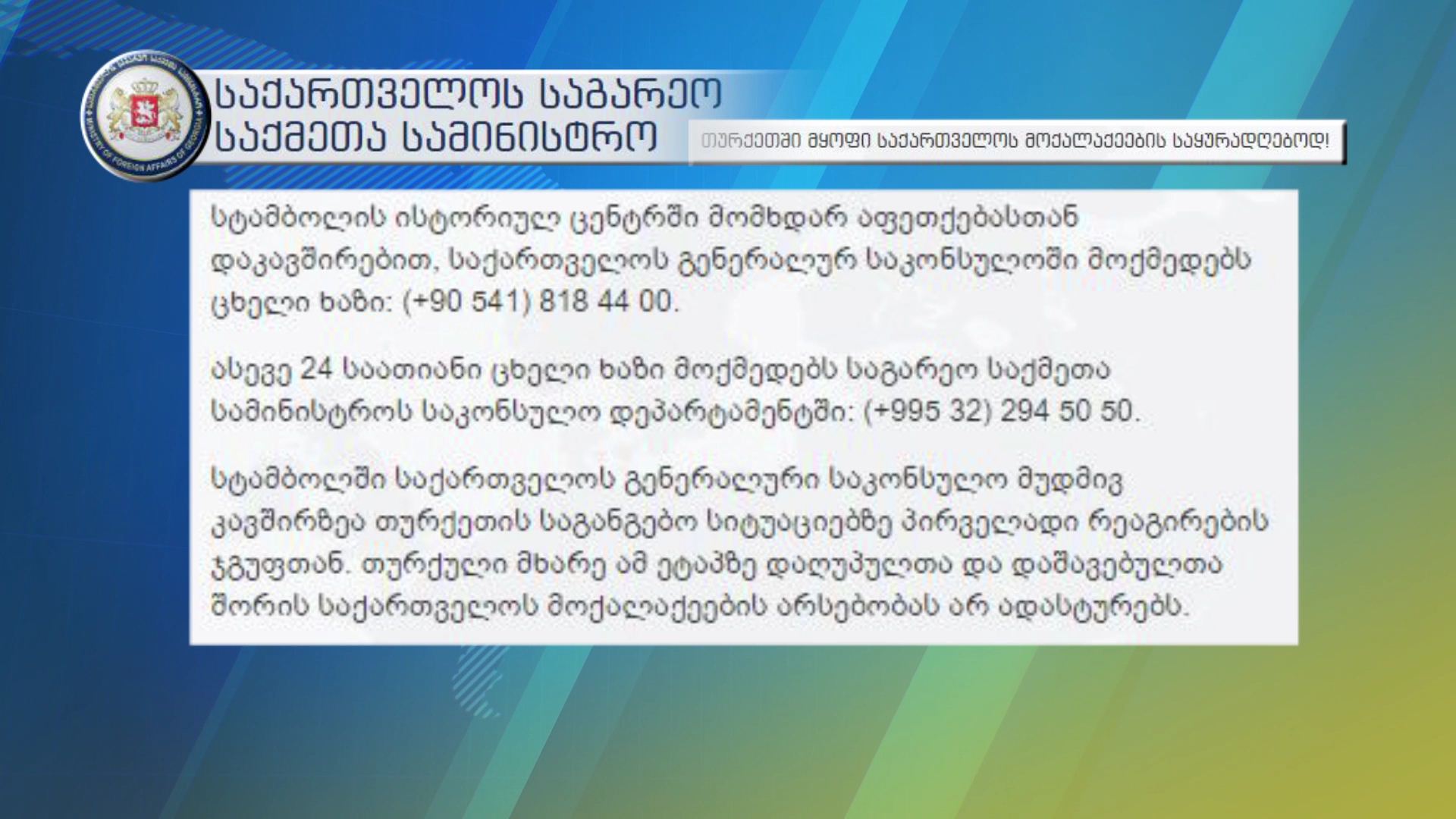 საქართველოს საგარეო უწყება თურქეთში მყოფი საქართველოს მოქალაქეების საყურადღებოდ განცხადებას ავრცელებს. "სტამბოლის ისტორიულ ცენტრში მომხდარ აფეთქებასთან დაკავშირებით, საქართველოს გენერალურ საკონსულოში მოქმედებს...