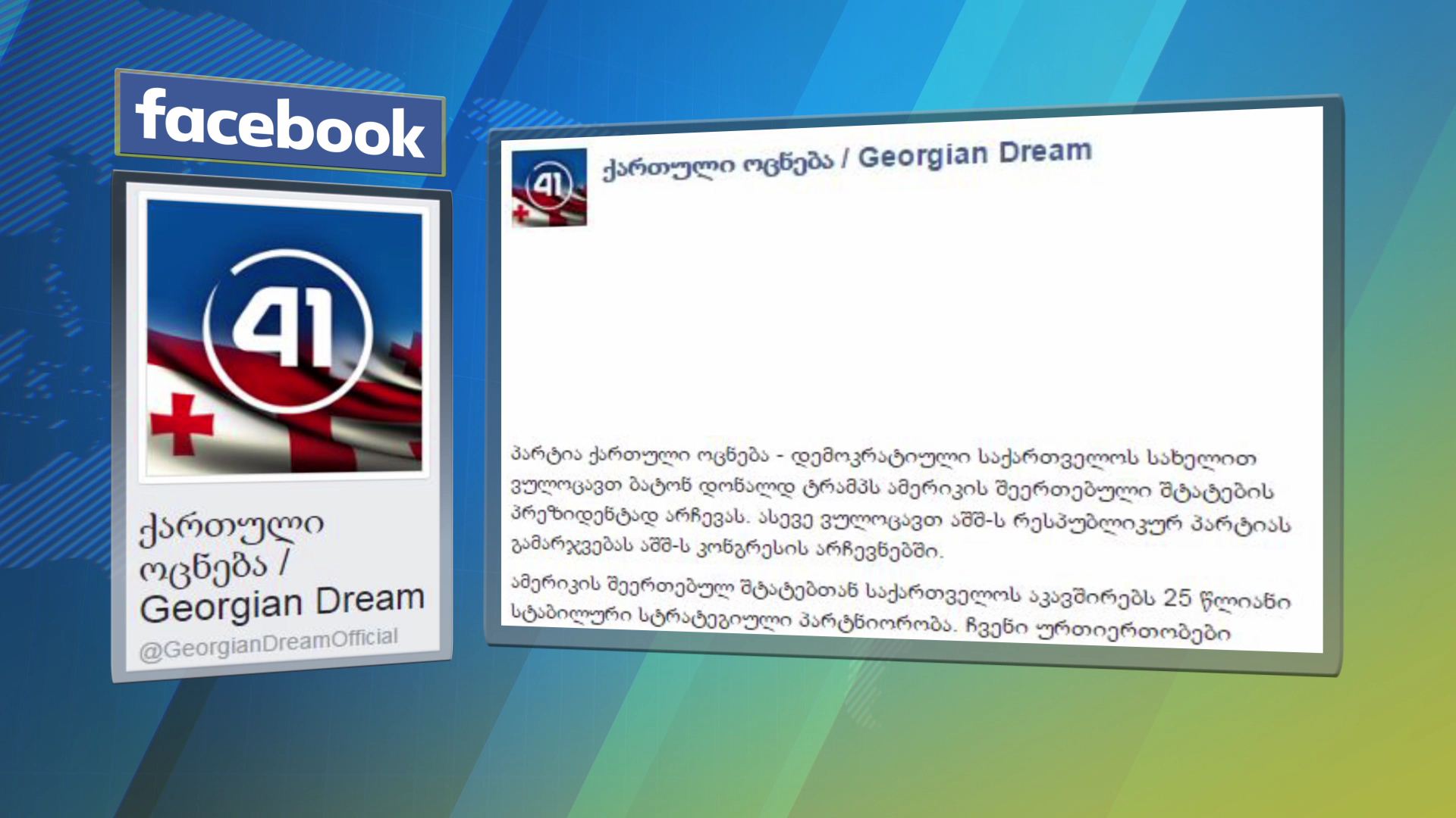 პარტია „ქართული ოცნება" დონალდ ტრამპს გამარჯვებას ულოცავს. წერილში ნათქვამია: „დარწმუნებული ვართ, რომ პრეზიდენტ ტრამპის ხელმძღვანელობით, საქართველო - ამერიკას შორის არსებული...