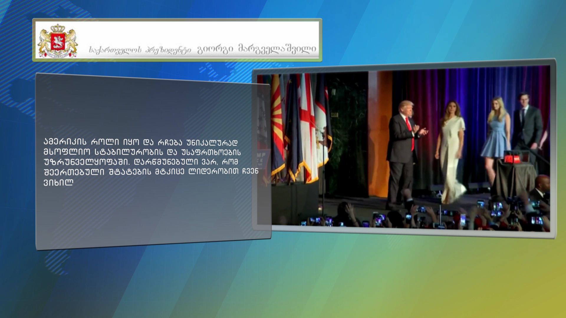 დონალდ ტრამპს აშშ-ს პრეზიდენტად არჩევას ულოცავს გიორგი მარგველაშვილი. ,,8 ნოემბერს ამერიკელმა ხალხმა ხმა მისცა შემდგომ განვითარებას, წარმატებას, მშვიდობას და უსაფრთხოებას...