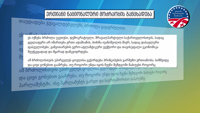 ''ვგმობთ შეთქმულების თეორიებს ლიდერების წინააღმდეგ და ივანიშვილის გარიგების შესახებ, ვემიჯნებით ყველას, ვინც შეურაცხმყოფელი ფორმით პარტიის დისკრედიტაციის კამპანიაში ჩაერთო''- ერთიანი ნაციონალური...