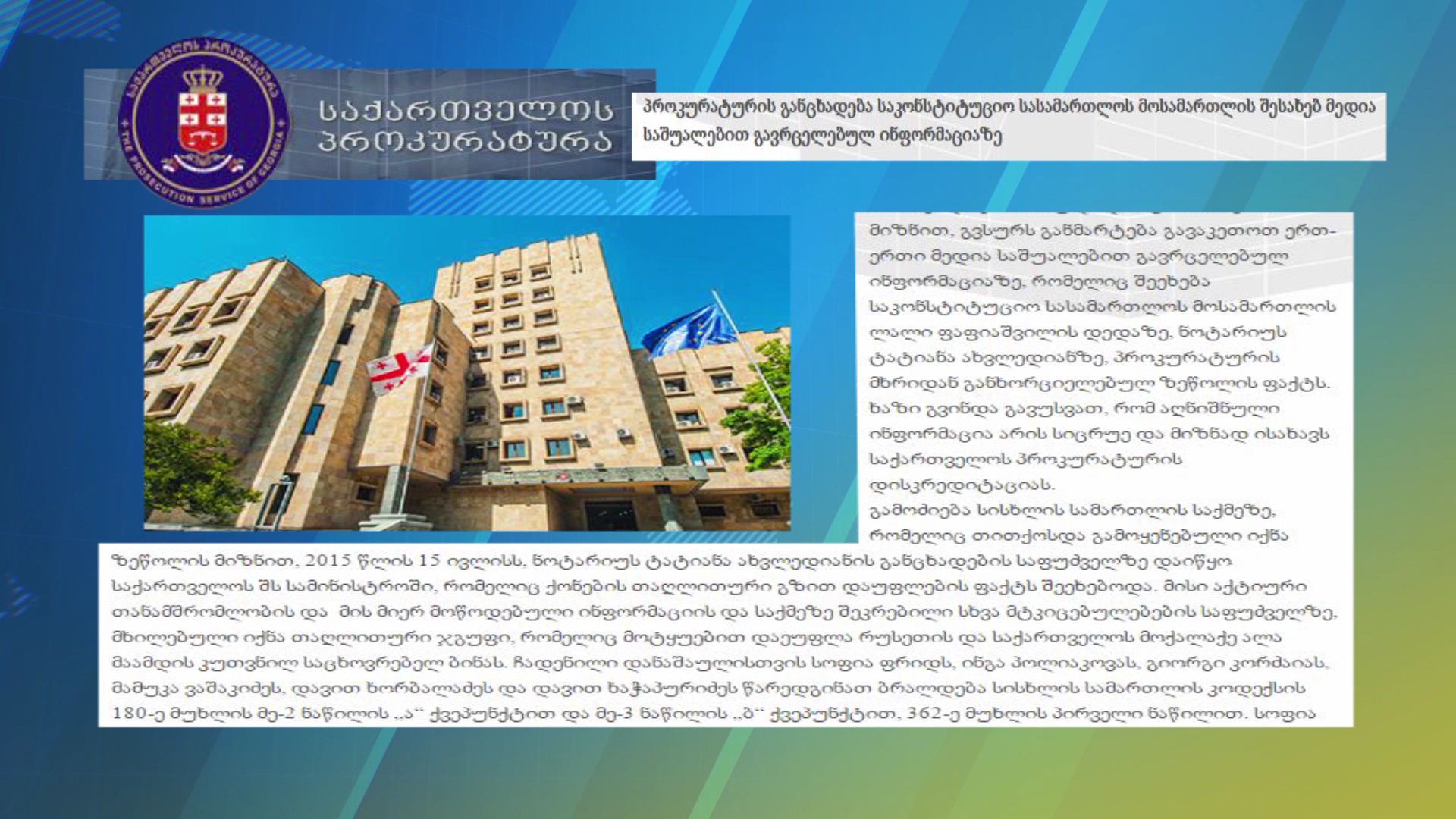 პროკურატურა საკონსტიტუციო სასამართლოს მოსამართლის ლალი ფაფიაშვილის შესახებ მედია საშუალებით გავრცელებულ ინფორმაციაზე განცხადებას ავრცელებს. უწყებაში სიცრუეს უწოდებენ ფაქტს, რომ ლალი ფაფიაშვილის...