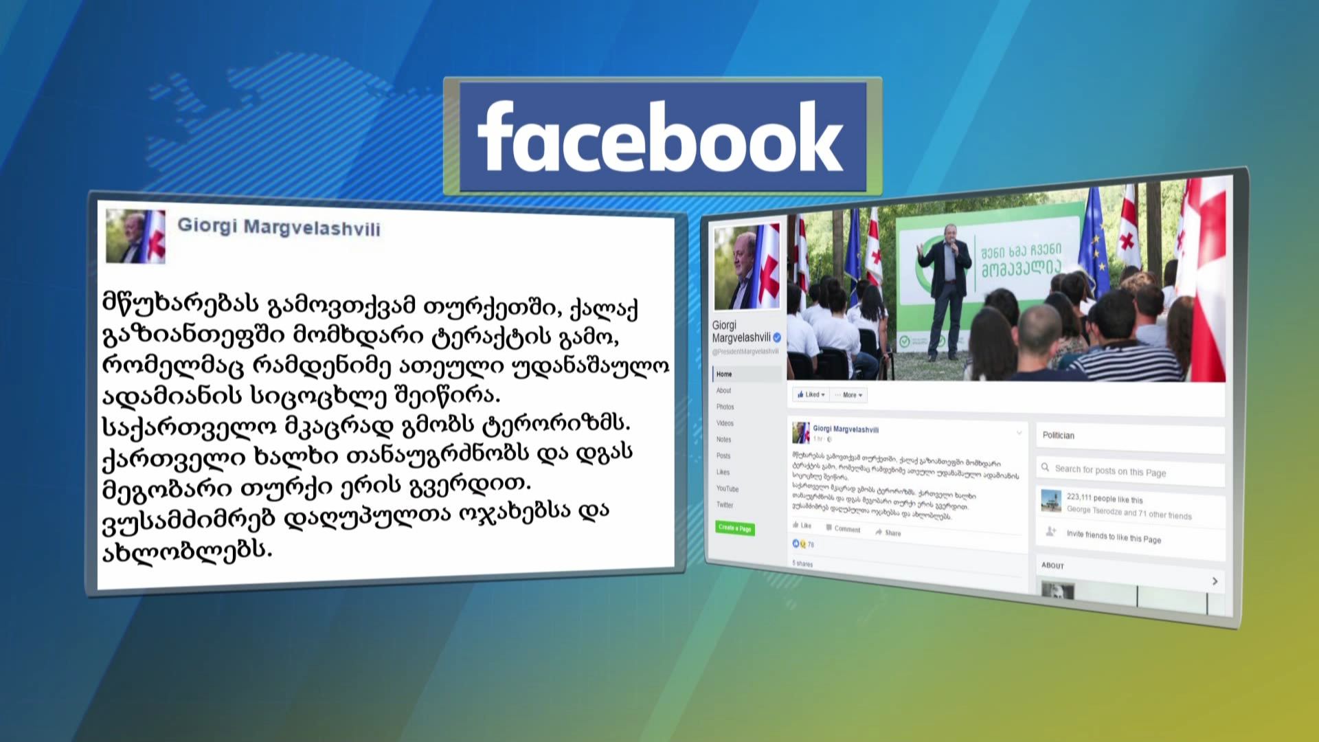 საქართველოს პრეზიდენტი თურქეთში მომხდარ ტერაქტზე მწუხარებას გამოთქვამს და განცხადებას ავრცელებს, სადაც წერია, რომ საქართველო მკაცრად გმობს ტერორიზმს. ქართველი ხალხი თანაუგრძნობს...