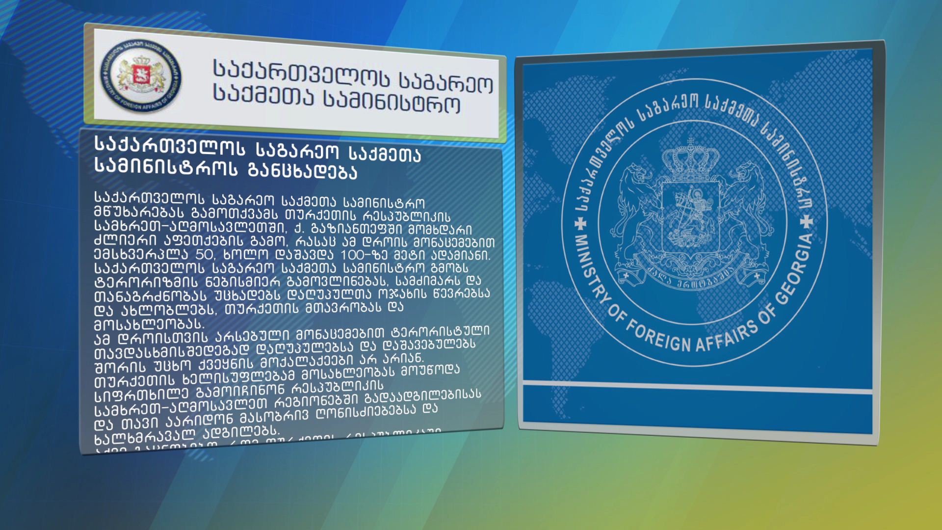 საქართველოს საგარეო საქმეთა სამინისტრო მწუხარებას გამოთქვამს თურქეთის ქალაქ გაზიანთეფში მომხდარი ძლიერი აფეთქების გამო. საგარეო უწყება ტერორიზმის ნებისმიერ გამოვლინებას გმობს და...