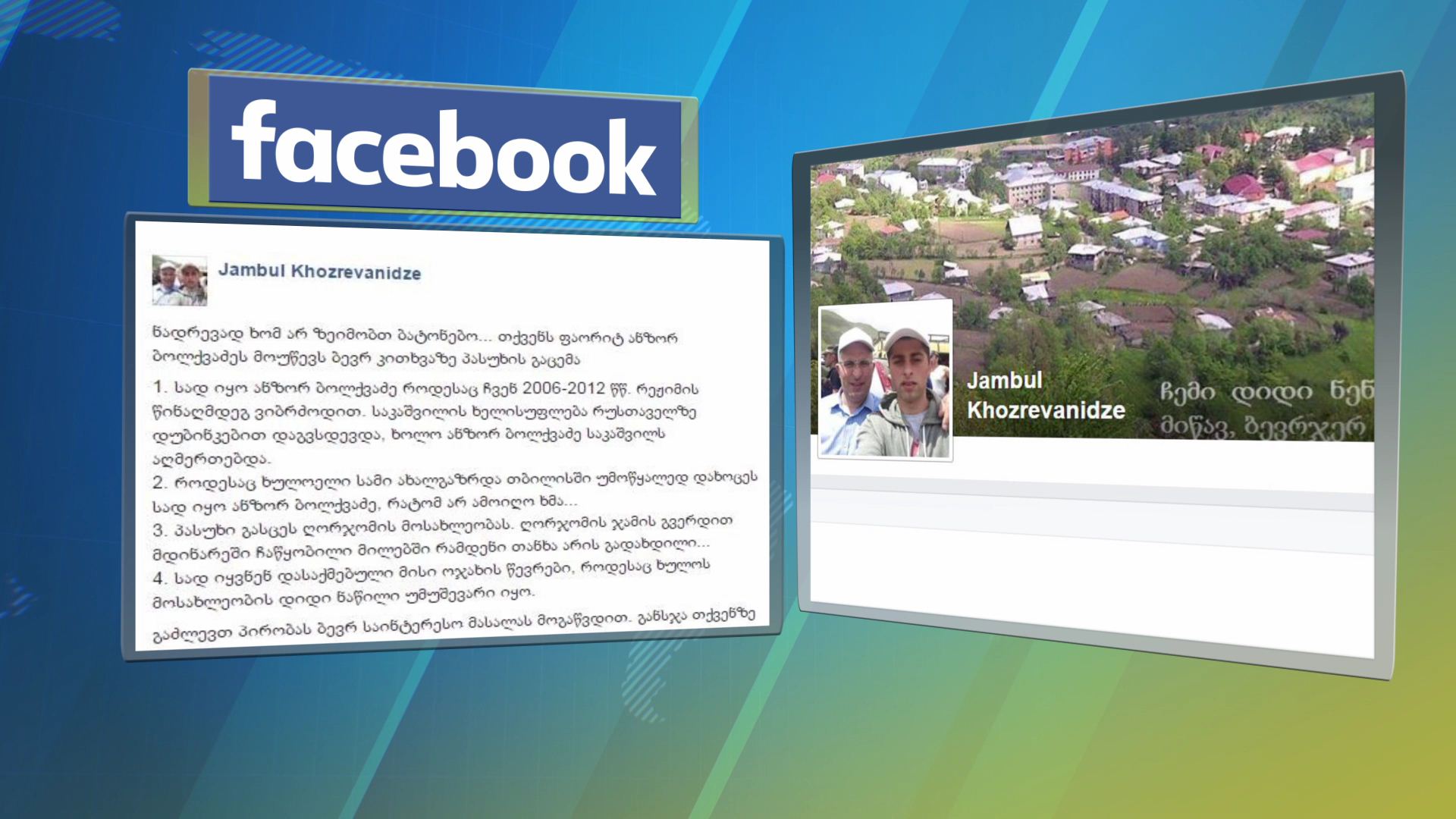 ფეისბუქში გამოხატული პროტესტი. ადრესატი ანზორ ბოლქვაძე. ავტორი - ჯამბულ ხოზრევანიძე. წერს, რომ “ქართული ოცნების” მაჟორიტარი დეპუტატობის კანდიდატი სააკაშვილს აღმერთებდა და...