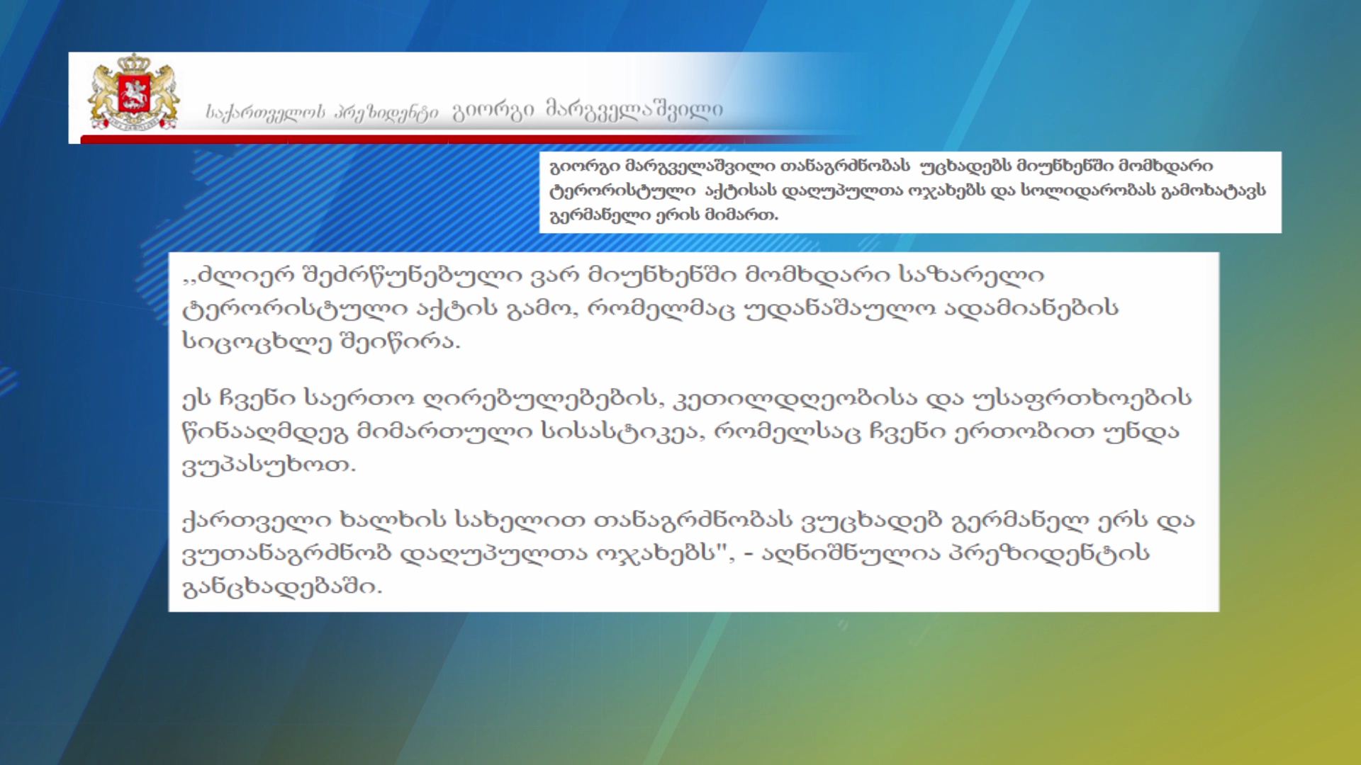 მიუნხენში მომხდარი თავადასხმის შედეგად დაღუპულთა ოჯახებს თანაგრძნობას უცხადებს საქართველოს პრეზიდენტი. ''შეძრწუნებული ვარ საზარელი ტერორისტული აქტის გამო, რომელმაც უდანაშაულო ადამიანების სიცოცხლე...