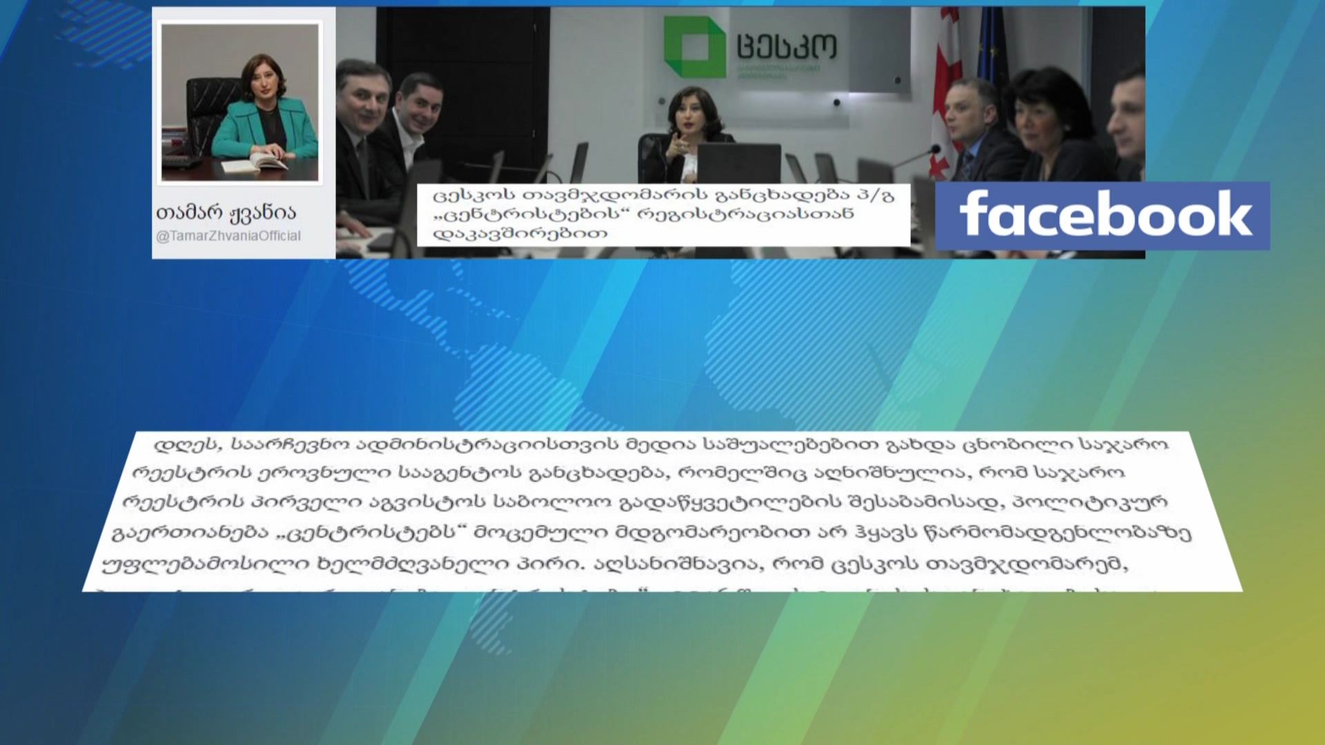 პარტია ,,ცენტრისტების” რეგისტრაციის საკითხზე საჯარო რეესტრის ეროვნული სააგენტოს განცხადებასთან დაკავშირებით ცესკოში განმარტებებს აკეთებენ. კომისიის თავმჯდომარე თამარ ჟვანიას განცხადებით, აღნიშნულ საკითხზე...