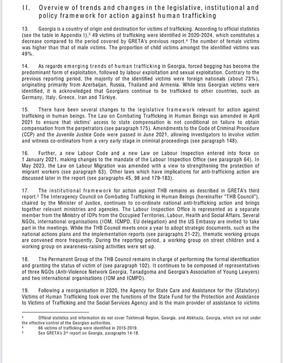 GRETA-ს შეფასების მე-4 რაუნდის ანგარიში იმეორებს ადამიანით ვაჭრობის (ტრეფიკინგის) თაობაზე აშშ-ის სახელმწიფო დეპარტამენტის ყოველწლიური ანგარიშის სულისკვეთებას, რომლის თანახმად ადამიანით ვაჭრობის (ტრეფიკინგის) დანაშაულის წინააღმდეგ განხორციელებული ღონისძიებებით საქართველო უკვე მე-10 წელია უმაღლეს საფეხურზეა და ინარჩუნებს ადგილს „პირველ კალათაში“.