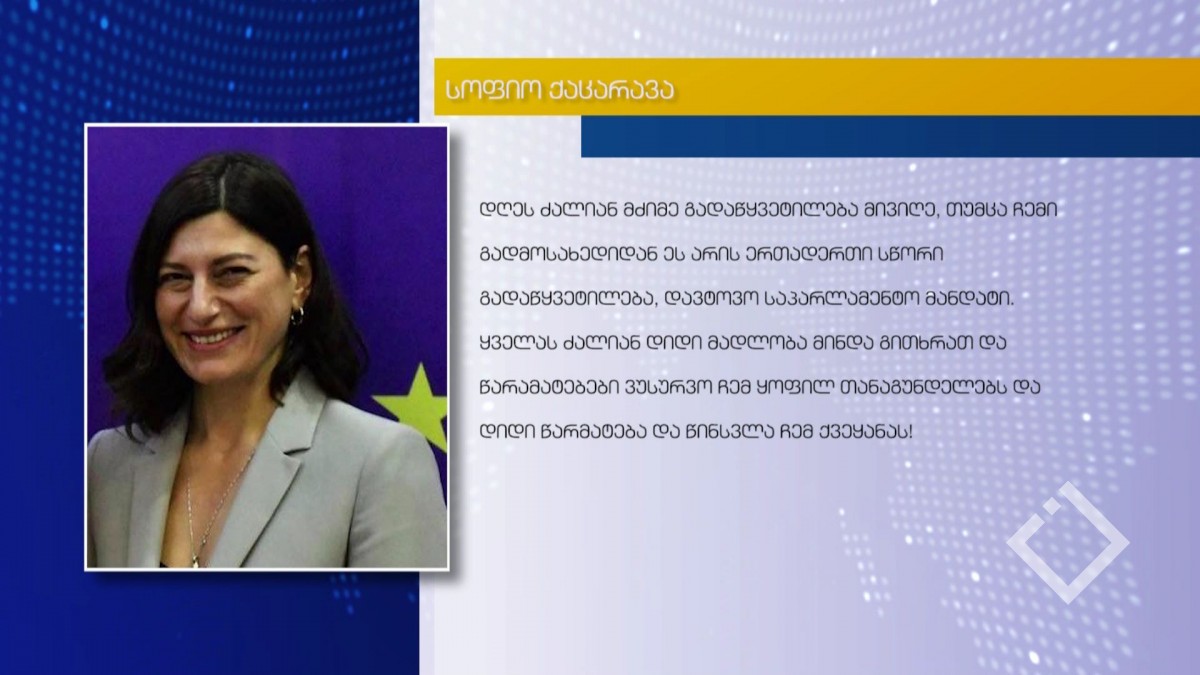 დეპუტატის მანდატს სოფიო ქაცარავაც ტოვებს. განცხადება მან სოციალურ ქსელში გაავრცელა. მისი თქმით, ეს მძიმე თუმცა მისი გადასახედიდან სწორი გადაწყვეტილებაა. სოფო ქაცარავა პარტია „ქართული ოცნების“ პროპორციული სიის მომდევნო წევრმა უნდა ჩაანაცვლოს. ვანო ზარდიაშვილის მიერ სადეპუტატო მანდატის დატოვების შემდეგ, „ქართული ოცნების“ პროპორციული სია თემურ გოცირიძეზე არის გაჩერებული, რომლის თაობაზეც პარლამენტს ცესკო-მ ინფორმაცია უნდა წარუდგინოს, რადგან მისი სადეპუტატო უფლებამოსილების ცნობა ჯერ არ მომხდარა.