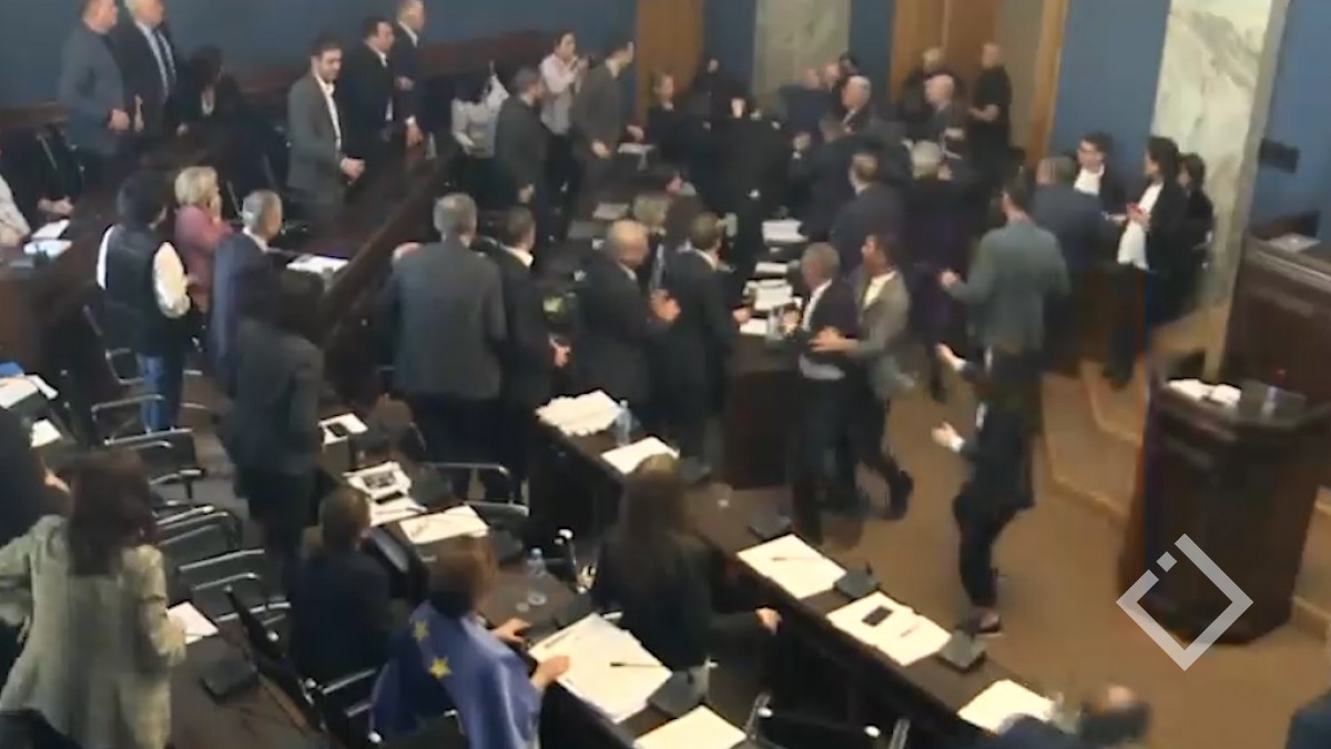 ფიზიკური დაპირისპირება საკანონმდებლო ორგანოში - პარლამენტში სადავო კანონპროექტის განხილვა იურიდიულ საკითხთა კომიტეტზე უკვე 6 საათის განმავლობაში ხმაურის ფონზე მიმდინარეობს.