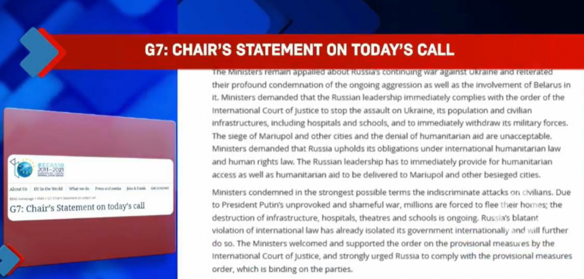 დიდი შვიდეულის საგარეო საქმეთა მინისტრები უკრაინაში მშვიდობიან მოსახლეობაზე განურჩეველ თავდასხმებს გმობენ და რუსეთს მოუწოდებენ, შეასრულოს ნაკისრი ვალდებულებები. მინისტრები მოითხოვენ, რომ...