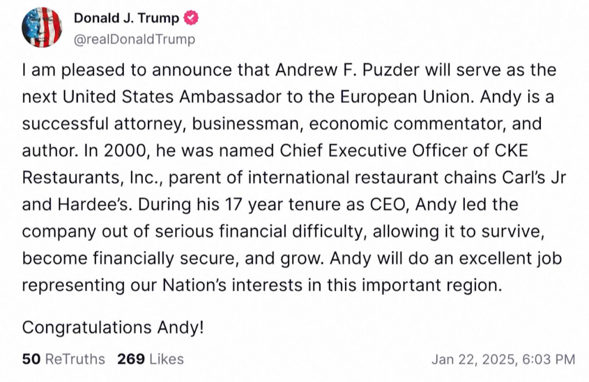 დონალდ ტრამპი ამერიკული სწრაფი კვების კორპორაციის ყოფილ აღმასრულებელ დირექტორს, ენდრიუ პუზდერს ევროკავშირში აშშ-ის ელჩად წარადგენს. ტრამპის თქმით, პუზდერი წარმატებული...