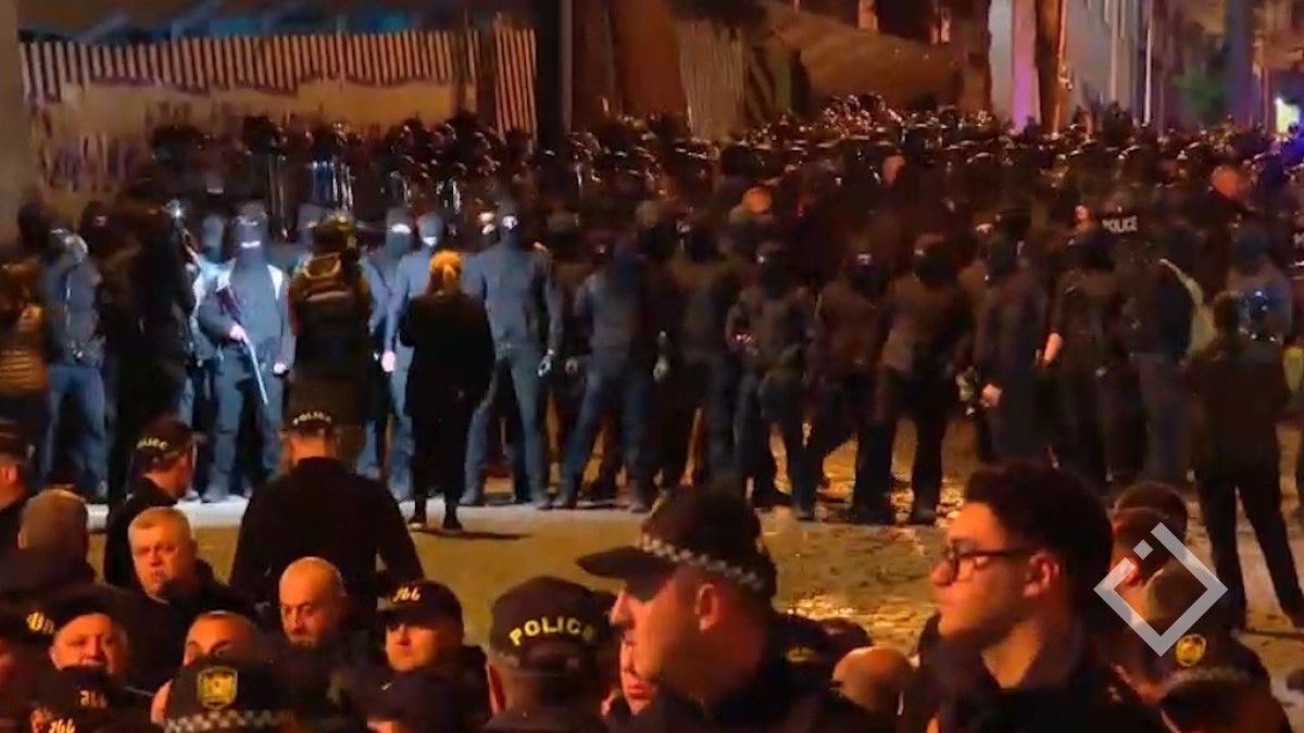 პარლამენტთან, 9 აპრილის ქუჩის მხარეს, პოლიციის კორდონია განლაგებული, რომლის უკან სპეცდანიშნულების რაზმი და წყლის ჭავლის მანქანა დგას. გადაკეტილია რუსთაველის გამზირი. აქციის...