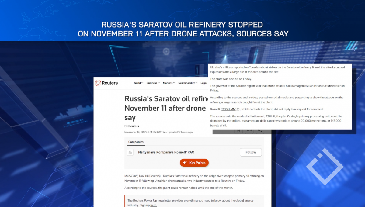 რუსეთში, სარატოვის ნავთობგადამამუშავებელ ქარხანას უკრაინული დრონებით თავდასხმის შემდეგ ნავთობის პირველადი გადამუშავება შეწყვეტილი აქვს. სააგენტო „როიტერის“ ცნობით, თავდასხმა 11 ნოემბერს მოხდა....