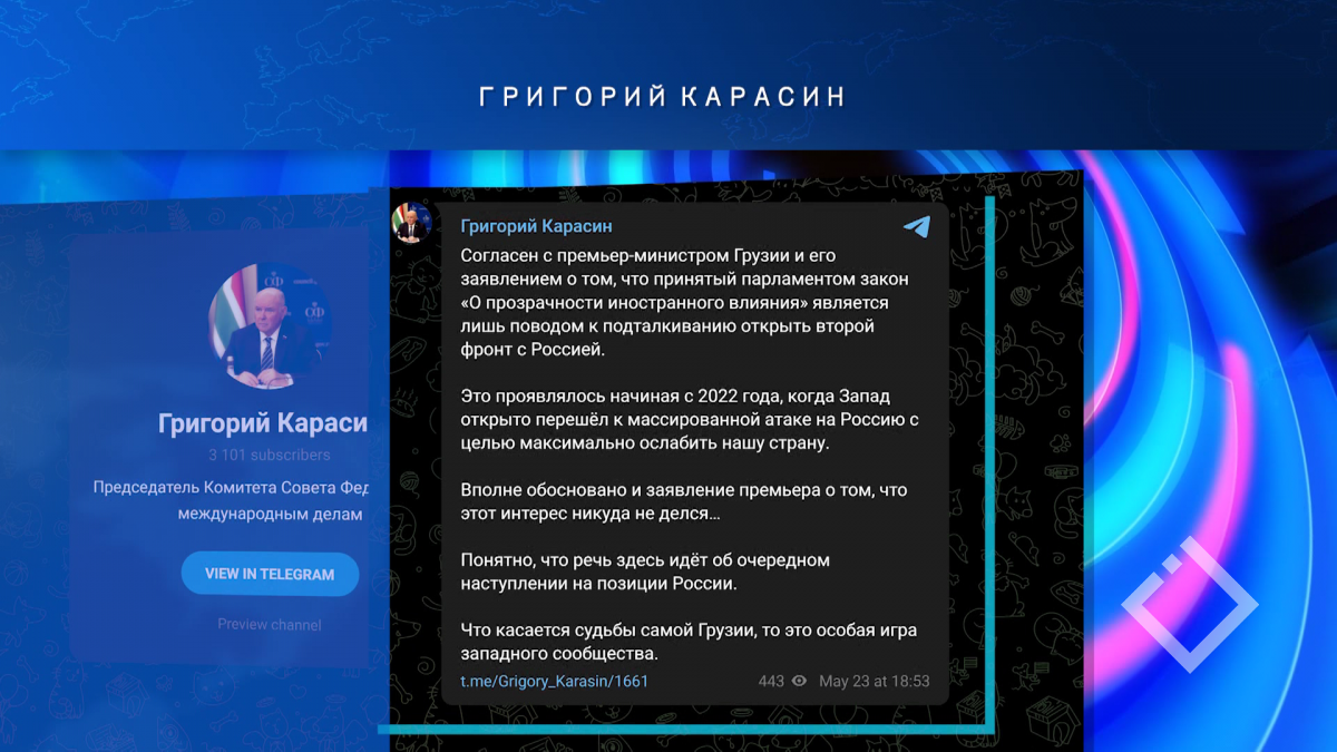 "ვეთანხმები საქართველოს პრემიერმინისტრის განცხადებას იმის შესახებ, რომ პარლამენტის მიერ მიღებული კანონი "უცხოური გავლენის გამჭვირვალობის" შესახებ არის მხოლოდ საბაბი რუსეთთან მეორე...