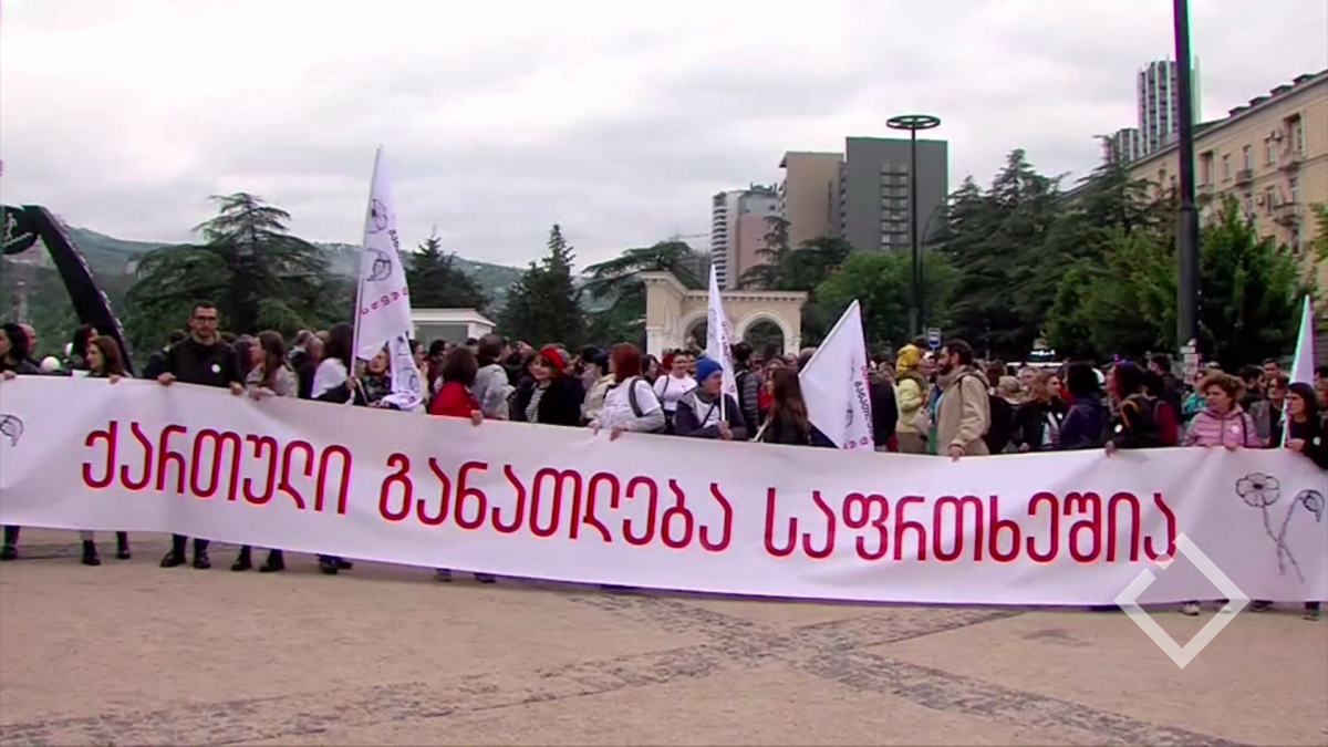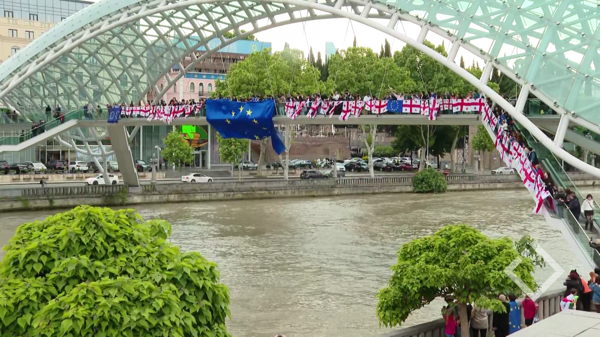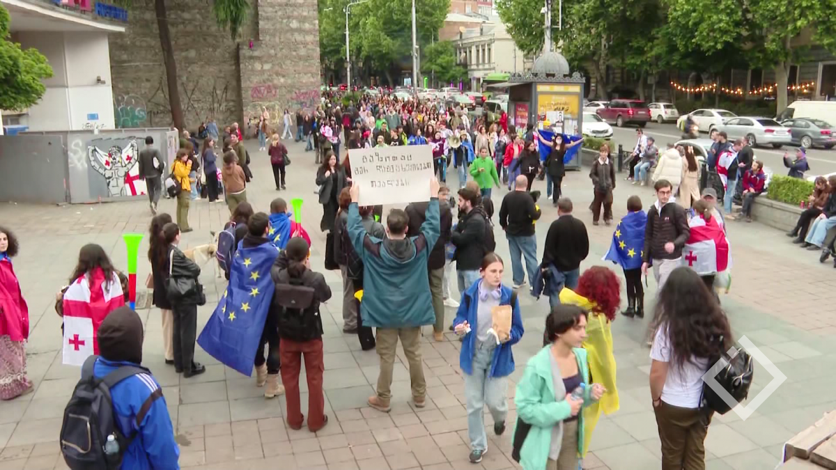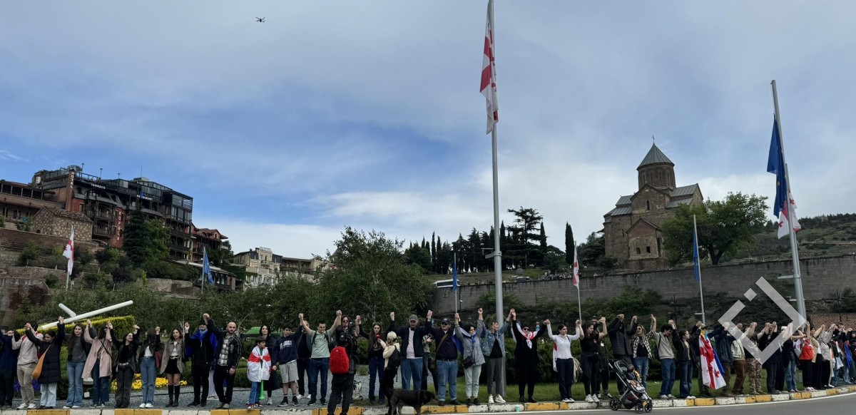 „ხელი ჩავკიდოთ გამარჯვებისთვის!“ - ამ სლოგანით, თბილისში, ევროპის მოედანზე „უცხოური გავლენის გამჭვირვალობის შესახებ“ კანონპროექტის გასაპროტესტებლად, სხვადასხვა უნივერსიტეტის, სტუდენტები აქცია-პერფორმანსს მართავენ.