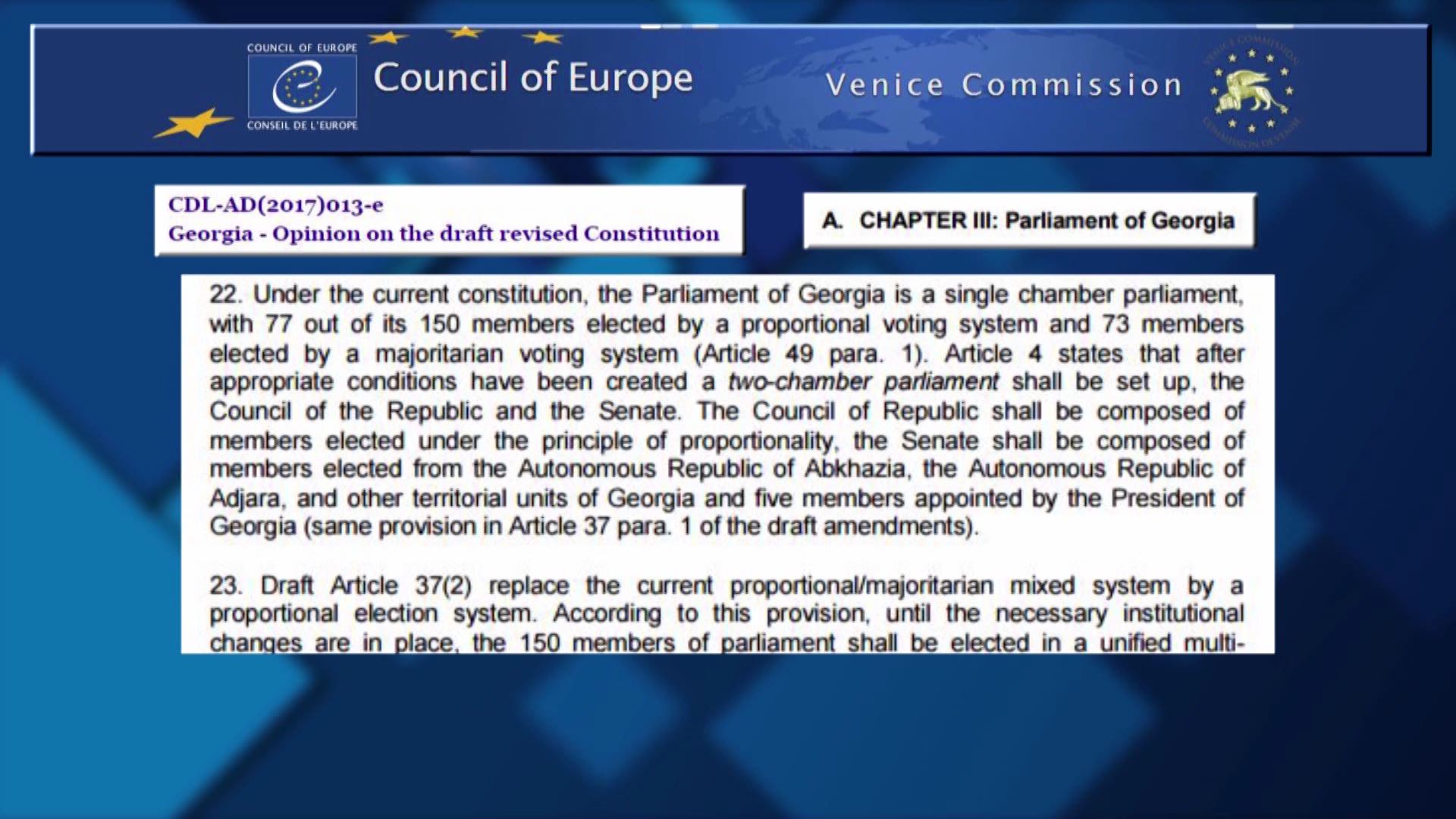 ვენეციის კომისიის დასკვნა და შეფასებები. საქართველოს კონსტიტუციის პროექტი ძირითადად დადებითადაა შეფასებული, თუმცა საუბარია საფრთხეებზე. რა საფრთხეებს ხედავენ კომისიის წევრები საარჩევნო...