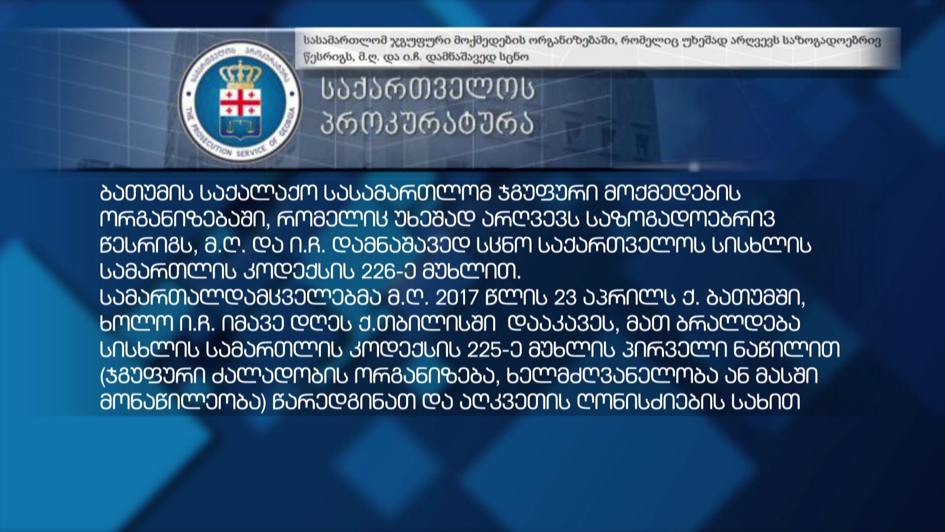 ბათუმის საქალაქო სასამართლოს დღევანდელ გადაწყვეტილებას პროკურატურა სააპელაციო სასამართლოში გაასაჩივრებს. განცხადება საგამოძიებო უწყებამ ცოტა ხნის წინ გაავრცელა.